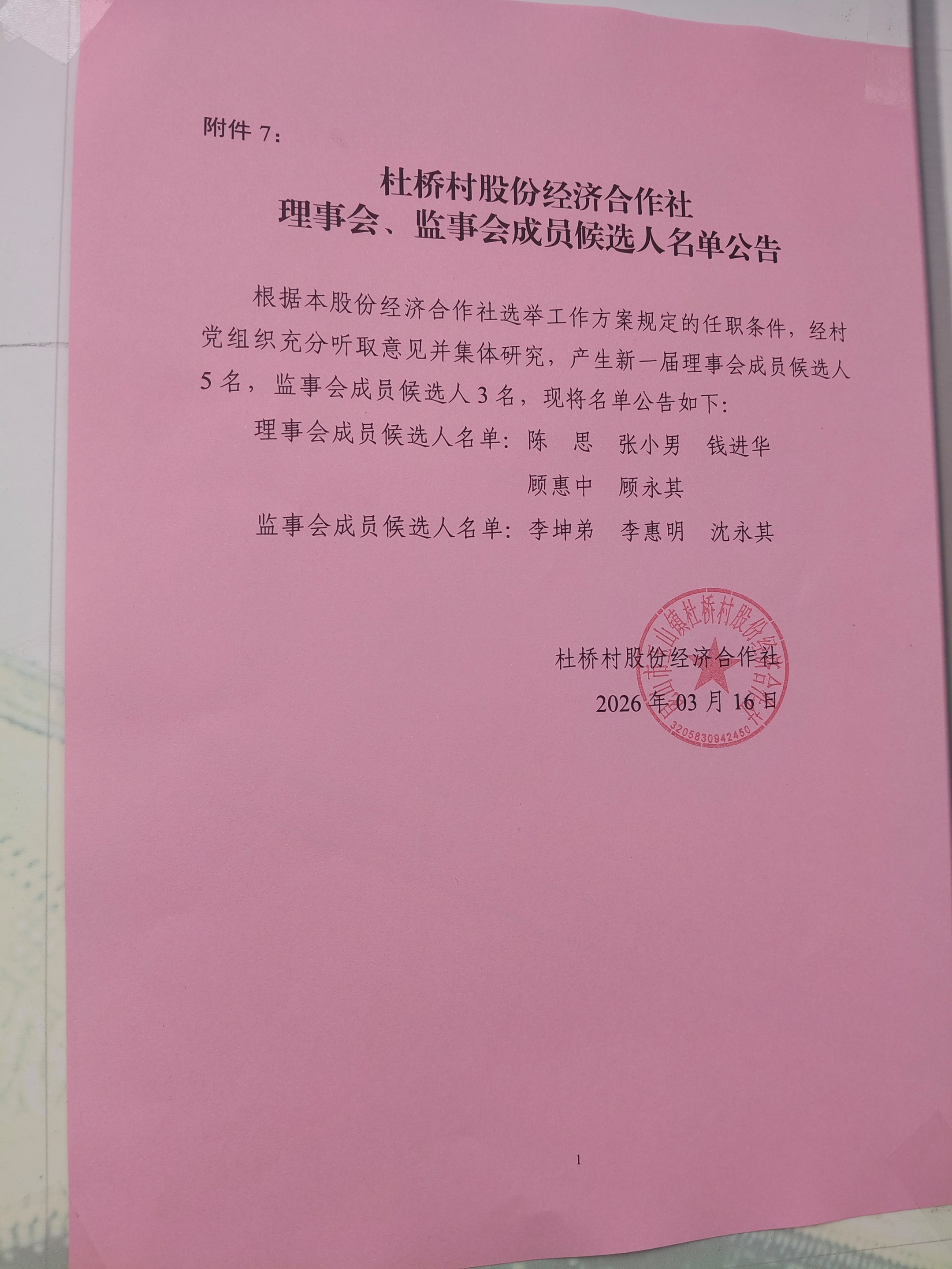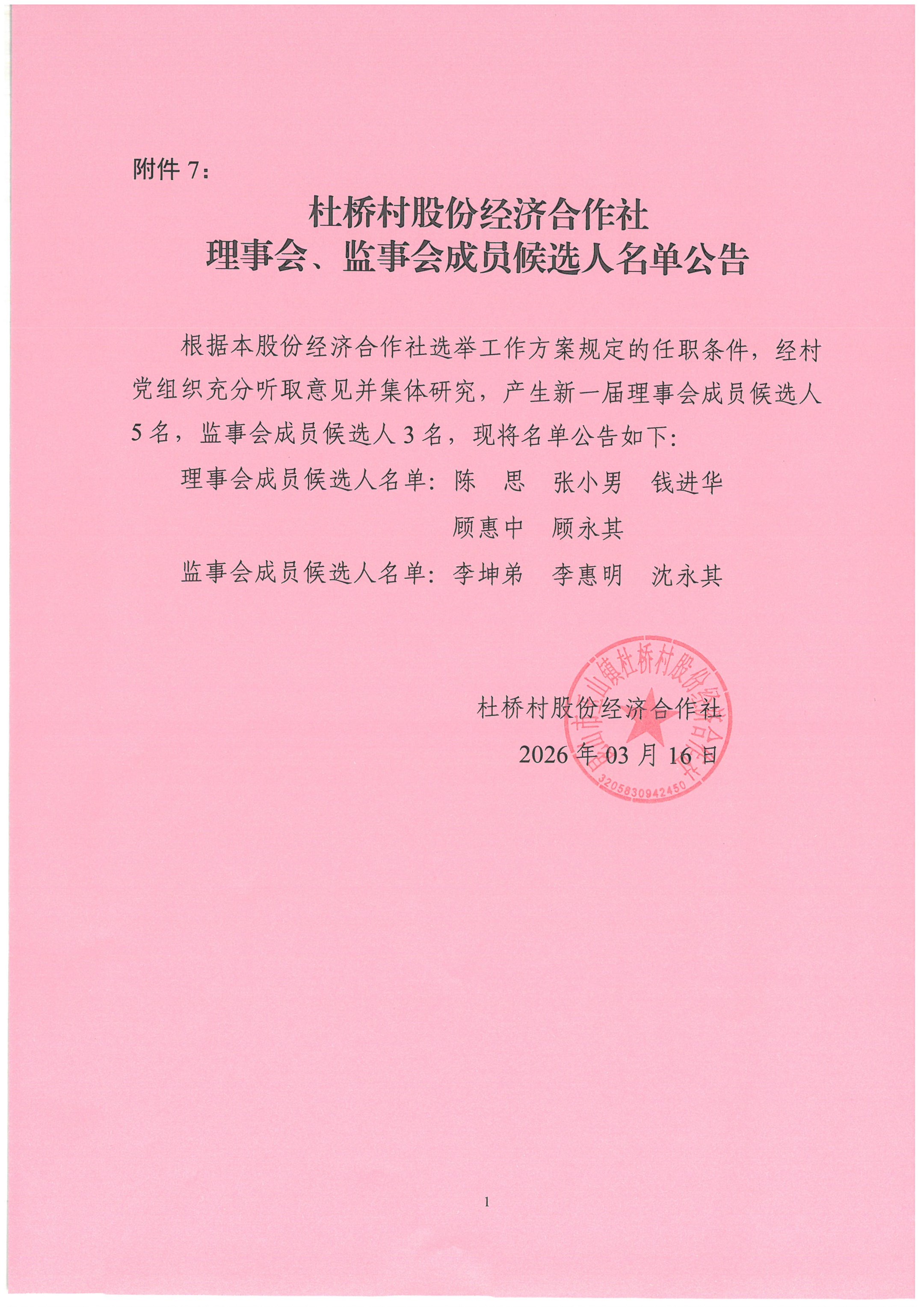 杜桥村股份经济合作社理事会、监事会成员候选人名单公告 第二轮