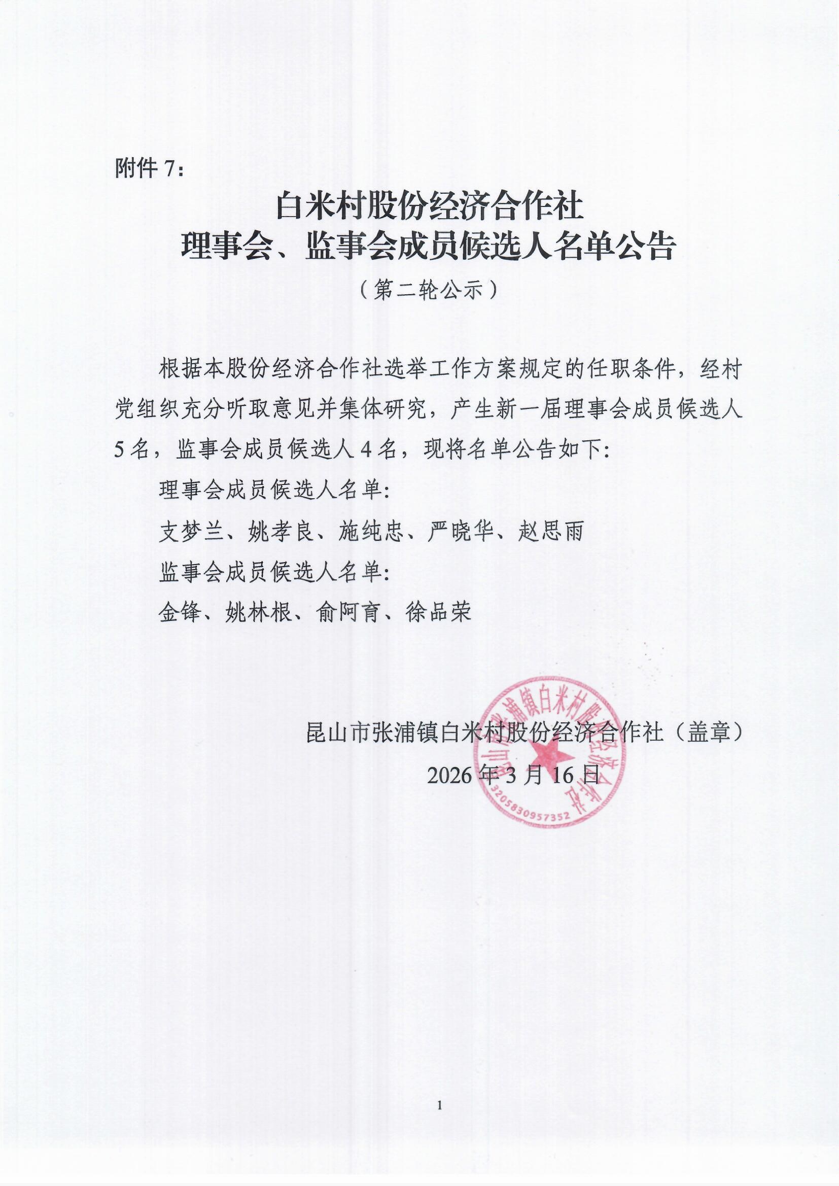 白米村股份合作社理事会、监事会成员候选人名单第二轮公示