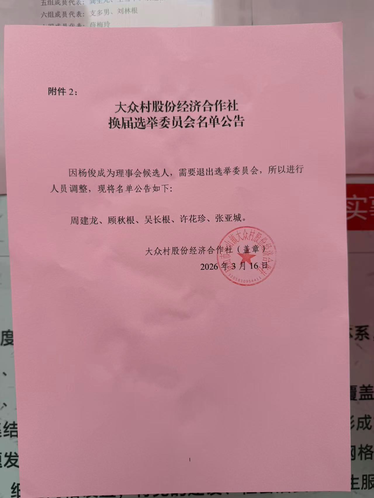 大众村股份经济合作社换届选举委员会名单公告