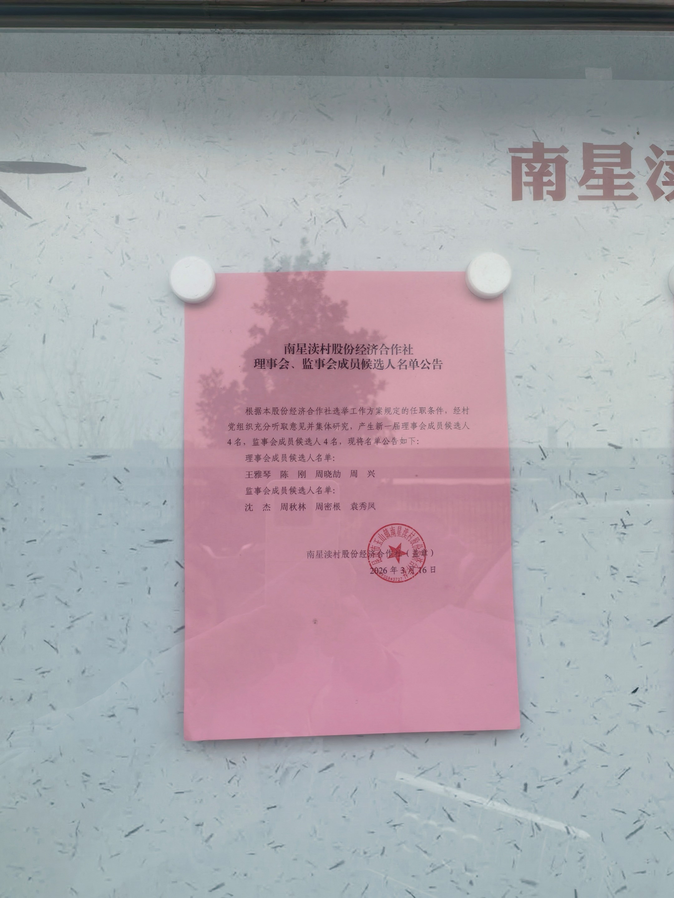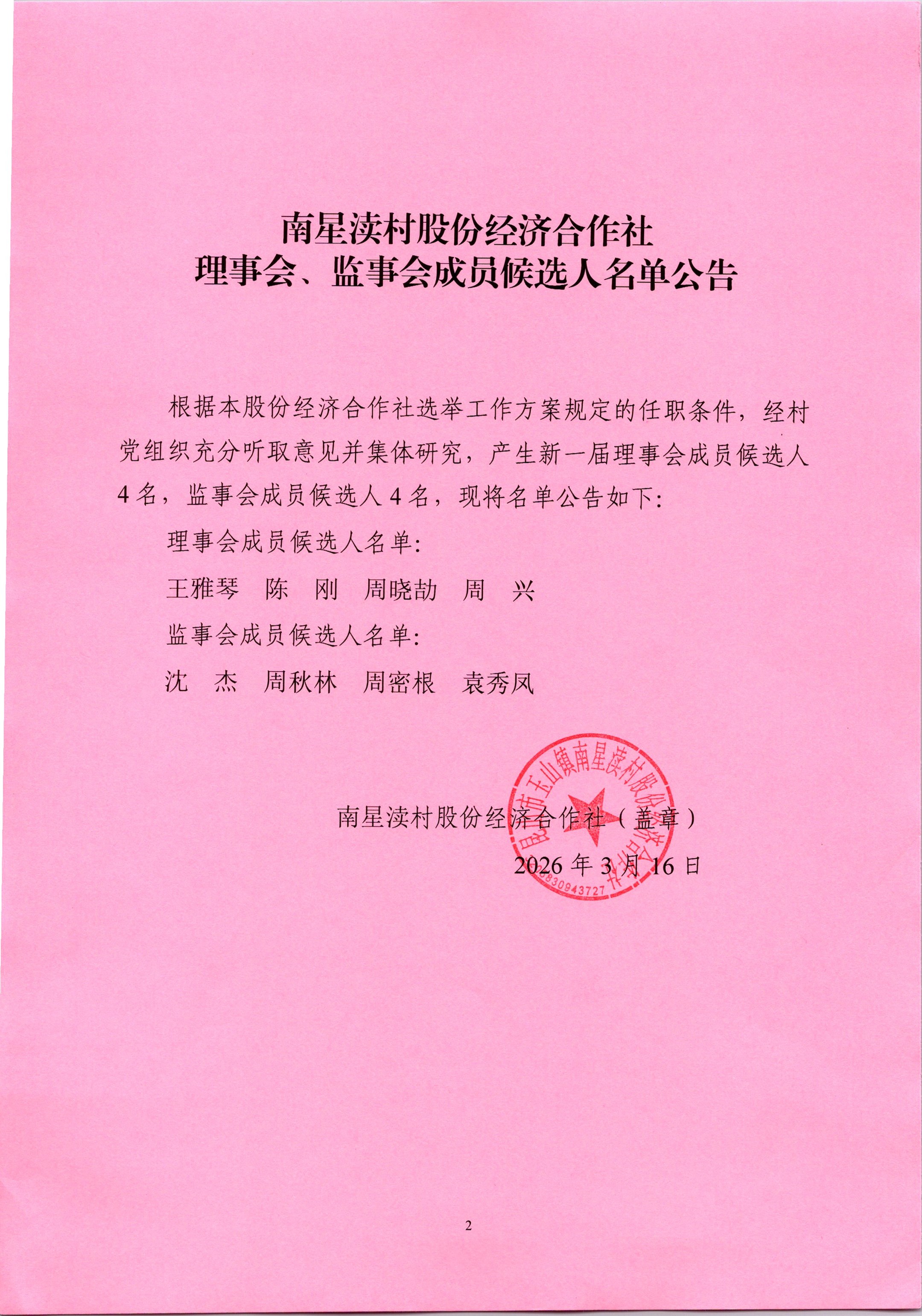 南星渎村股份经济合作社理事会、监事会成员候选人名单公告