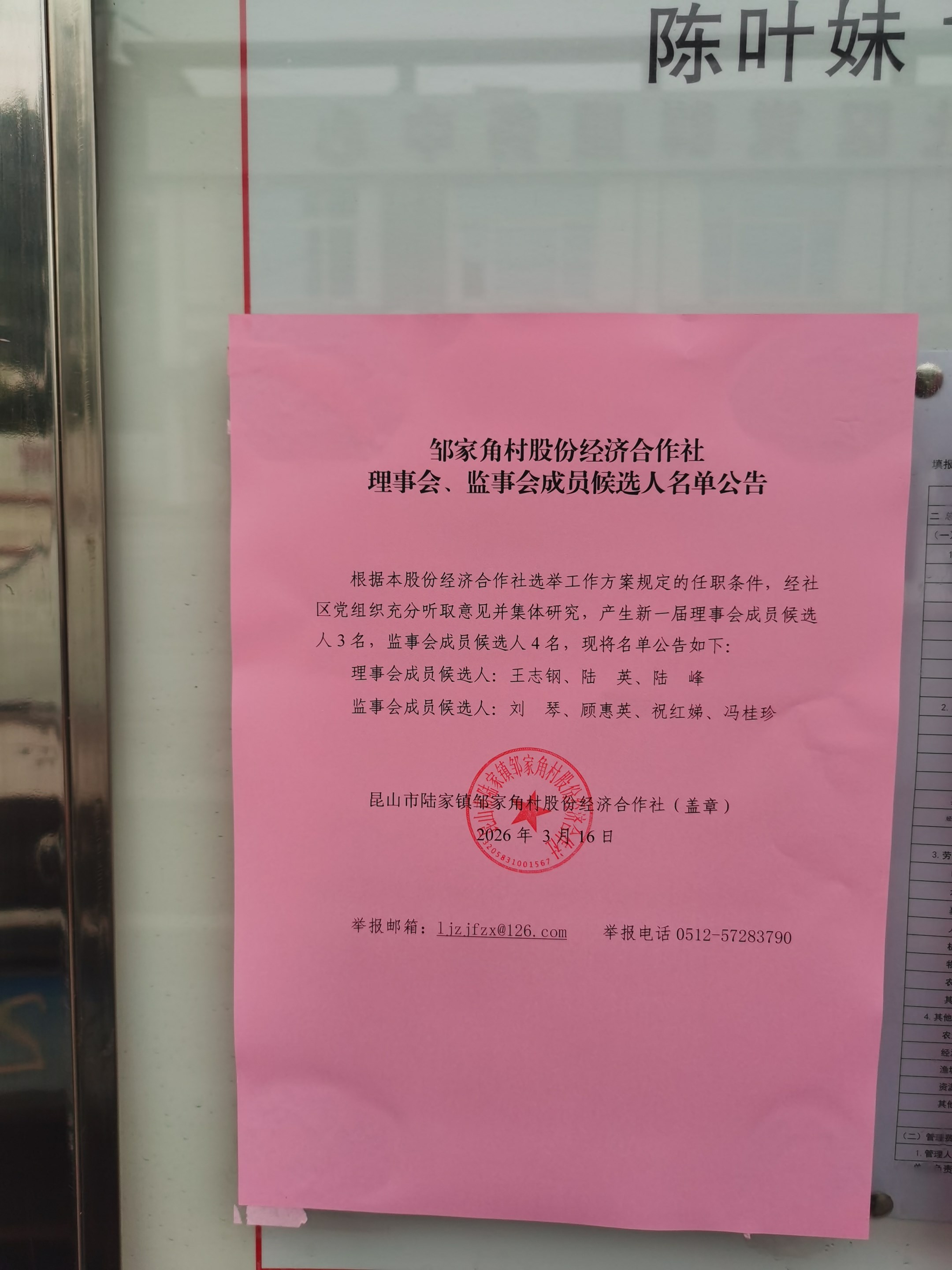 邹家角村股份经济合作社理事会、监事会成员候选人名单公告