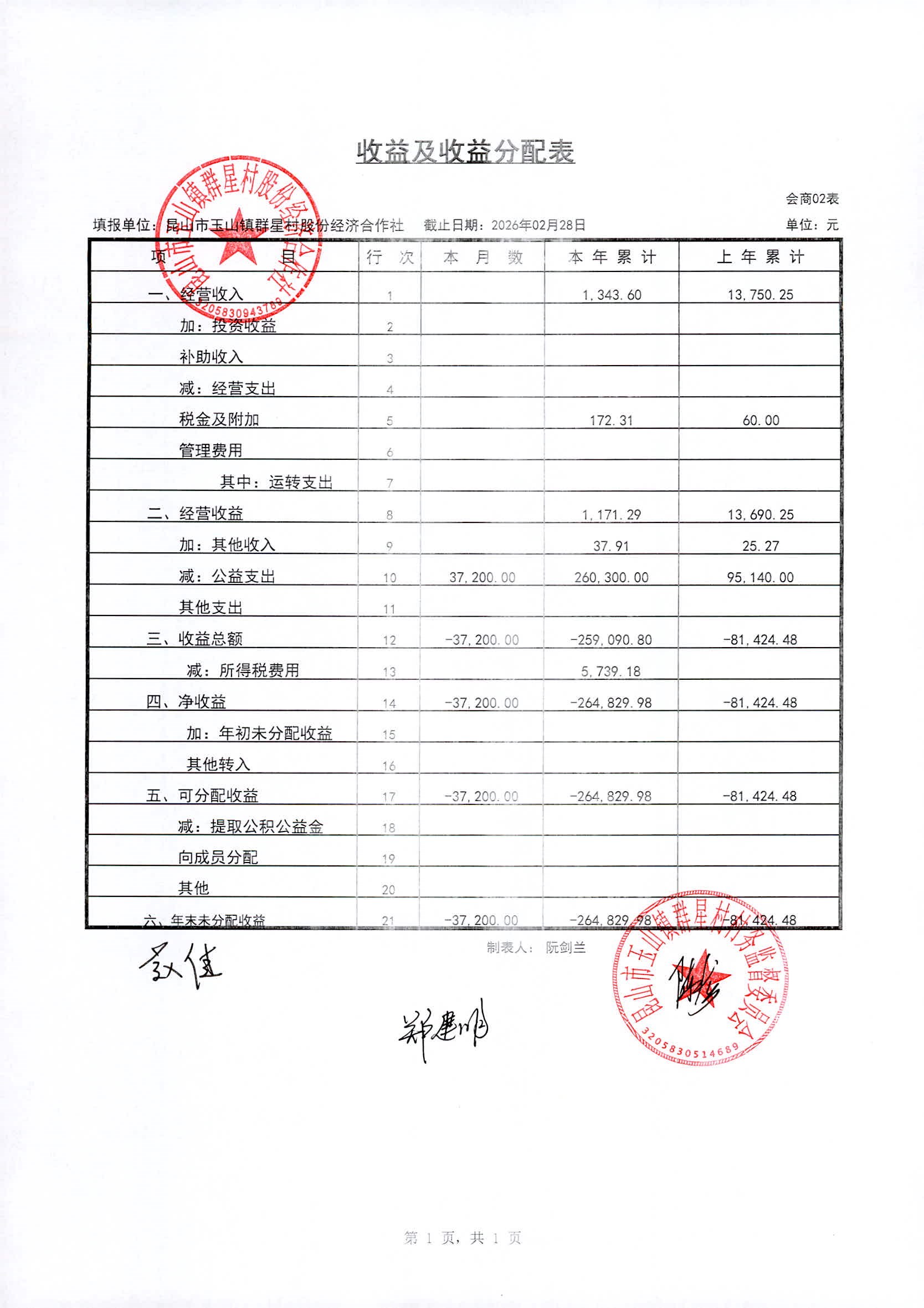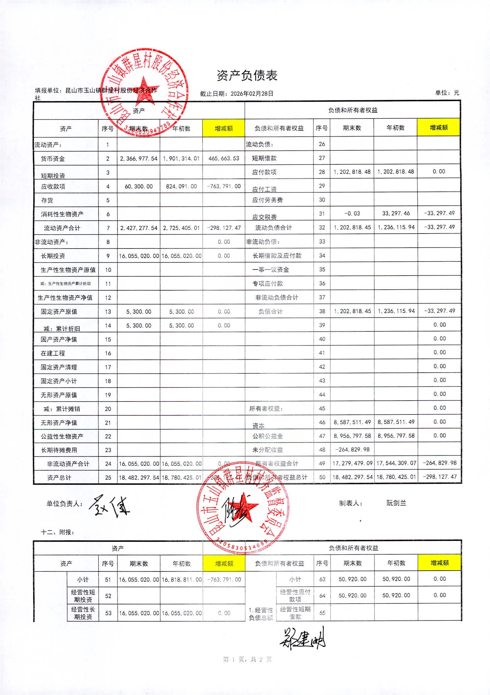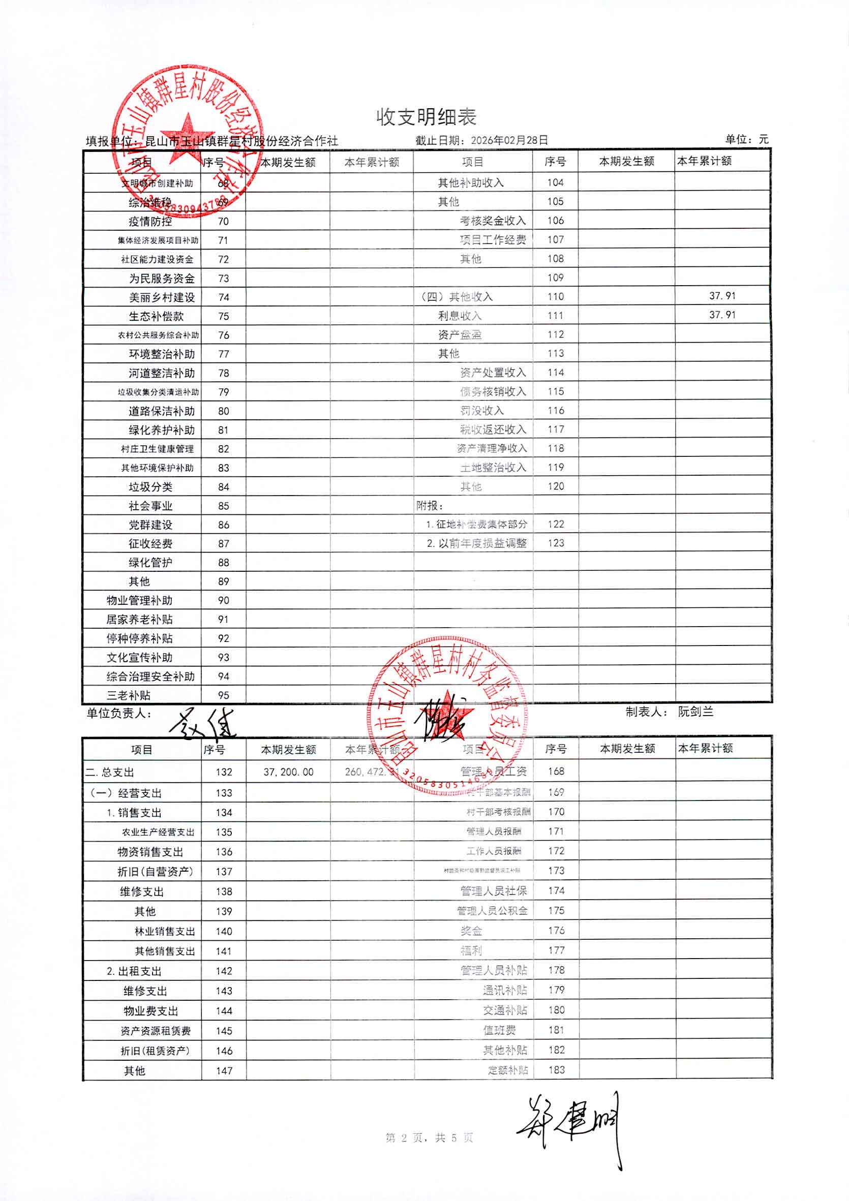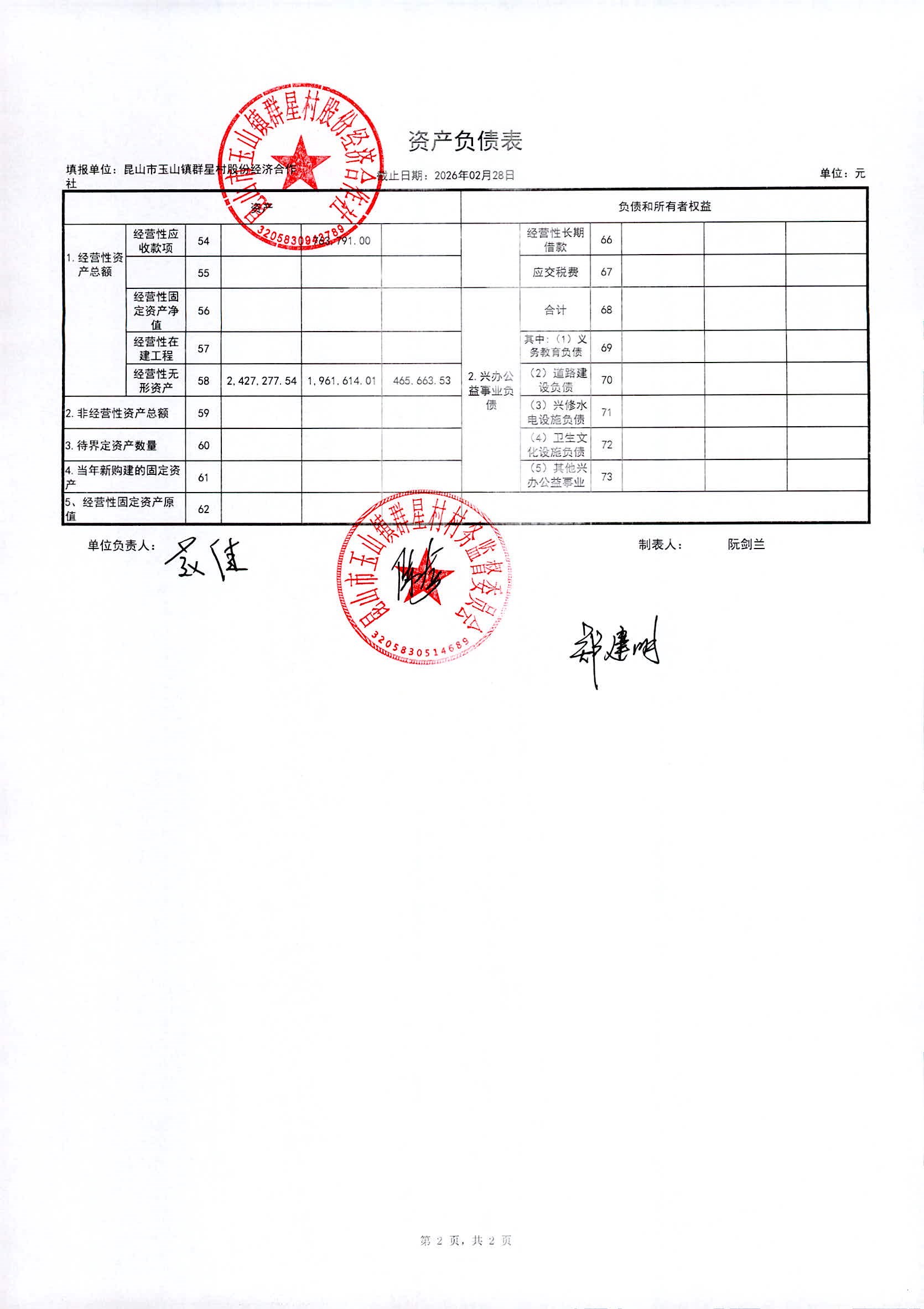 昆山高新区群星村2026年03月份公开股份经济合作社2026年02月财务信息