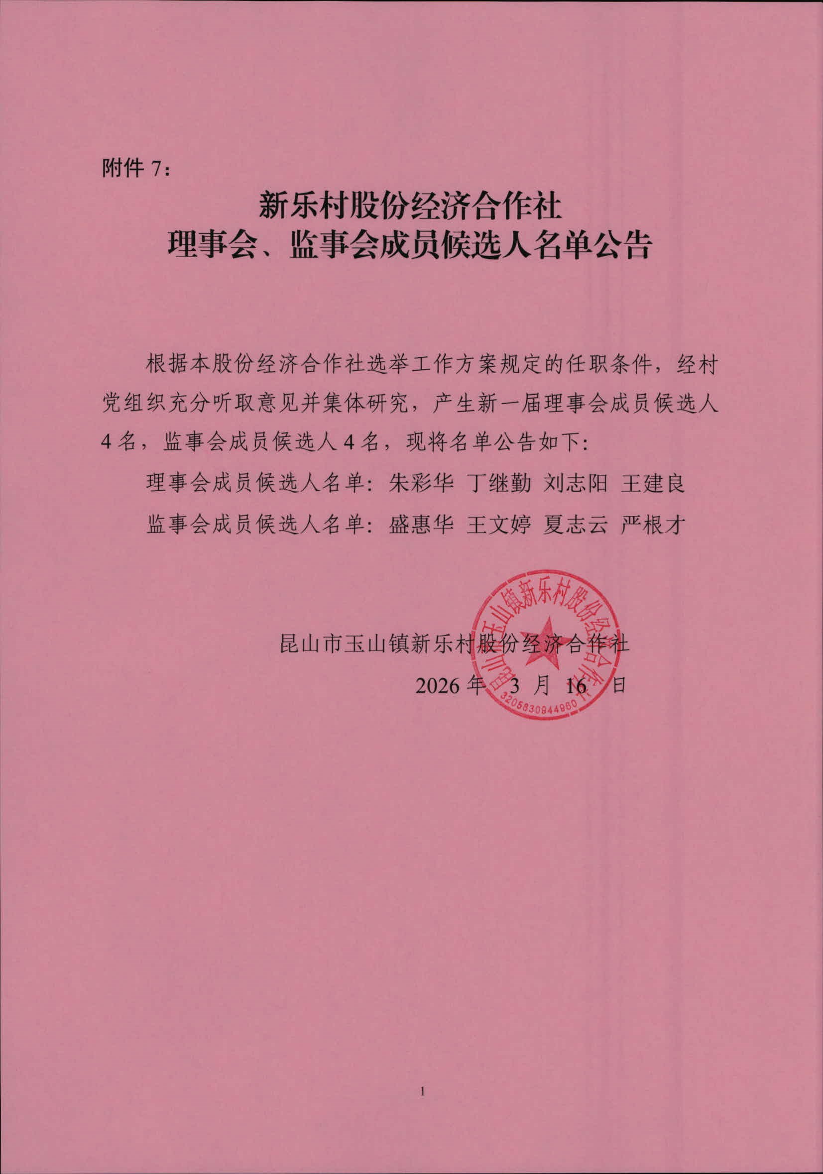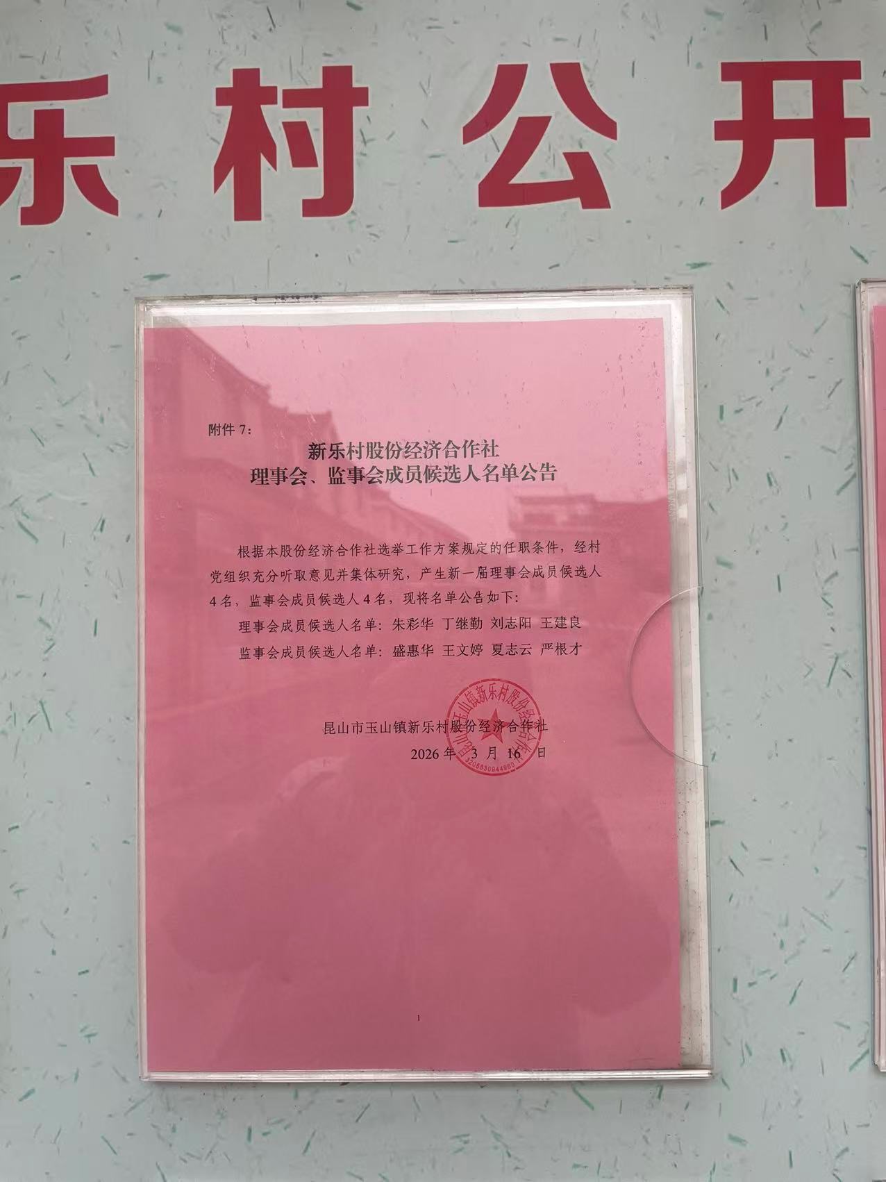 第二轮新乐村股份经济合作社理事会、监事会成员候选人名单公示