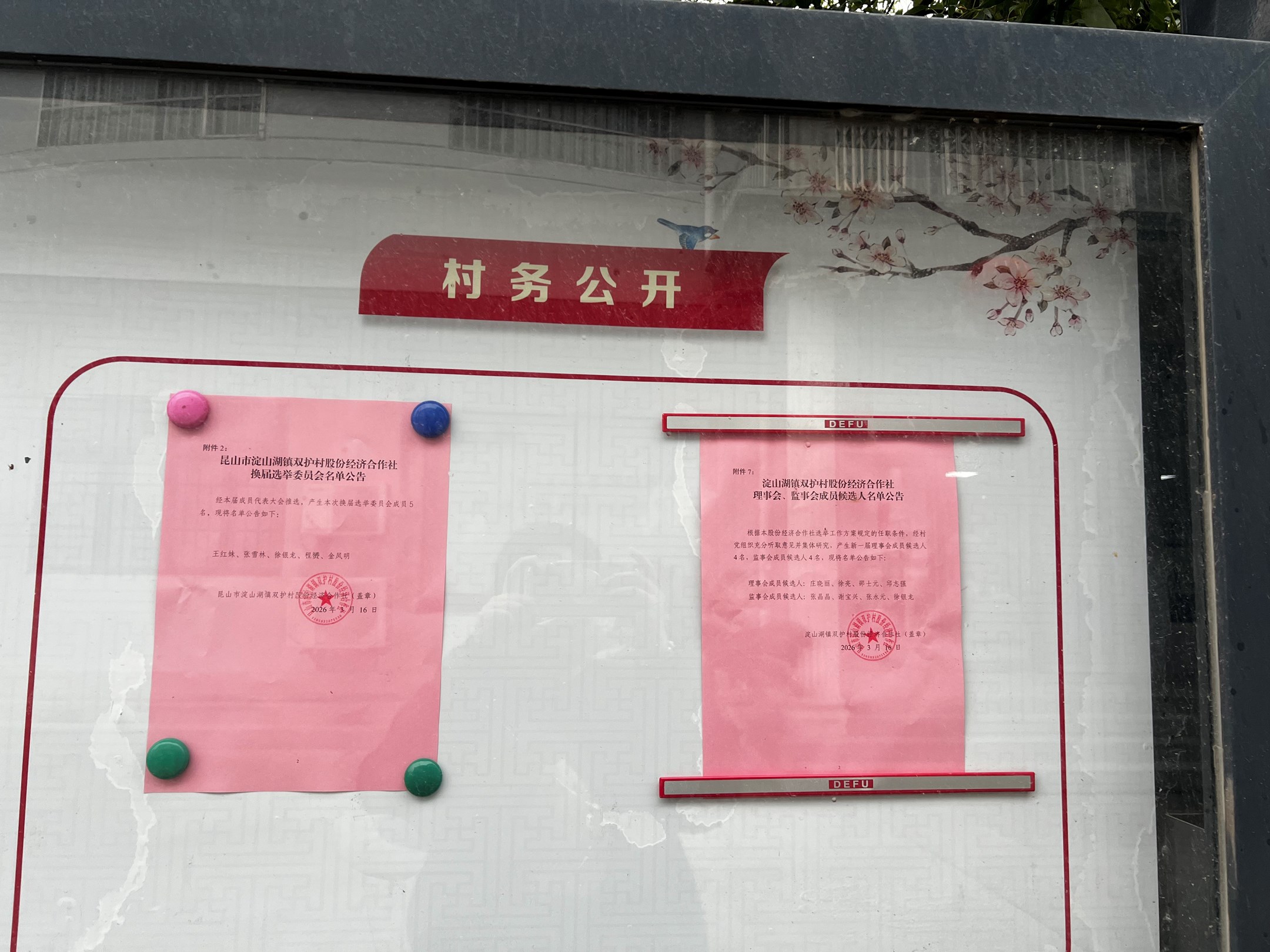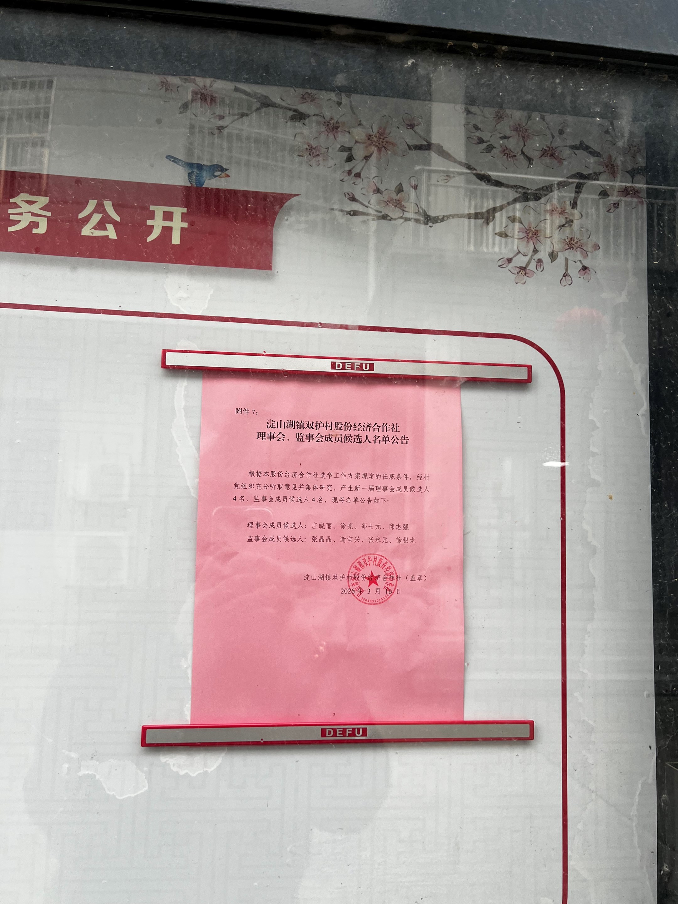 淀山湖镇双护村股份经济合作社 理事会、监事会成员候选人名单公告(第二次)