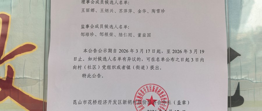 新胡村股份经济合作社理事会、监事会成员候选人预备名单公告