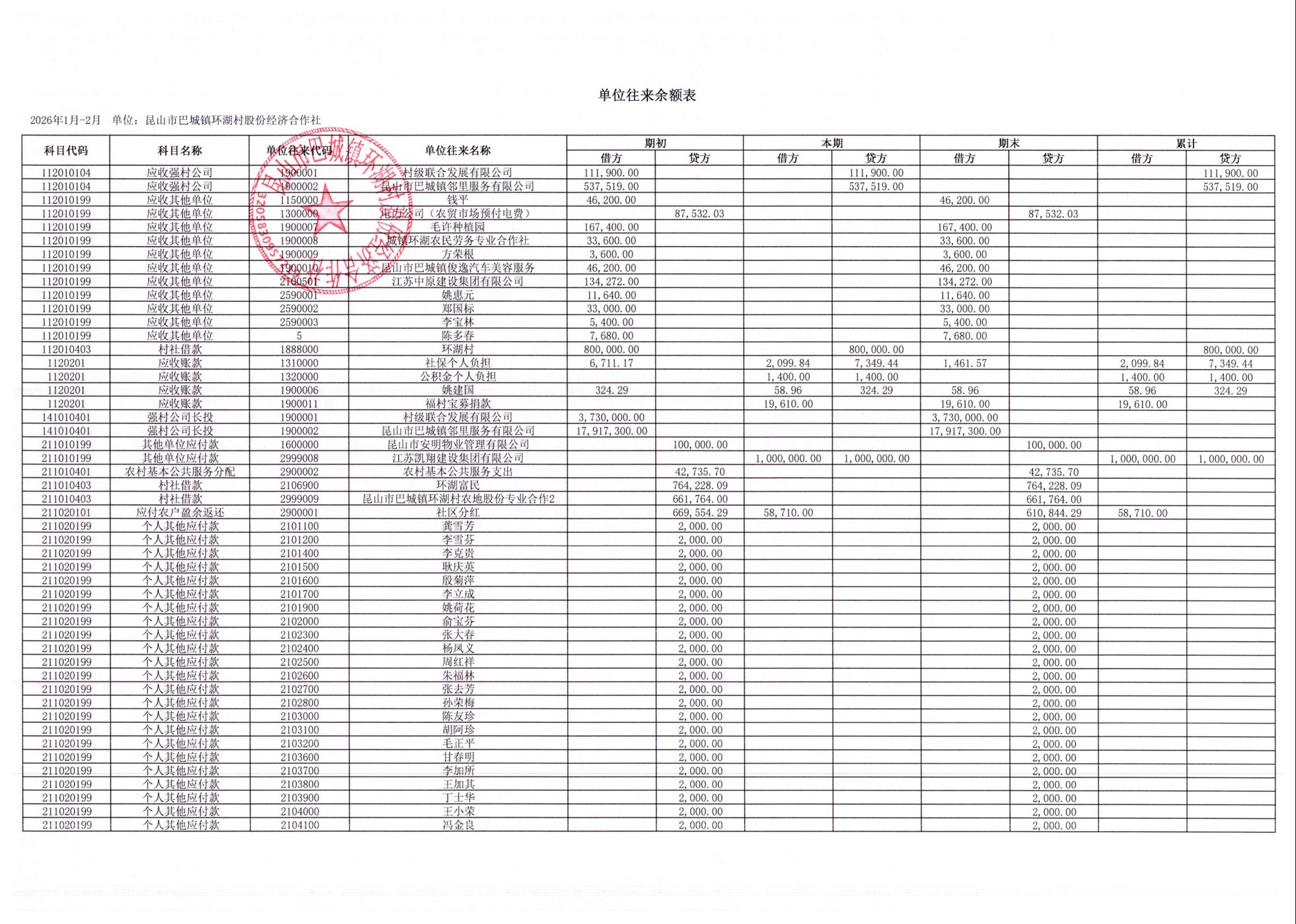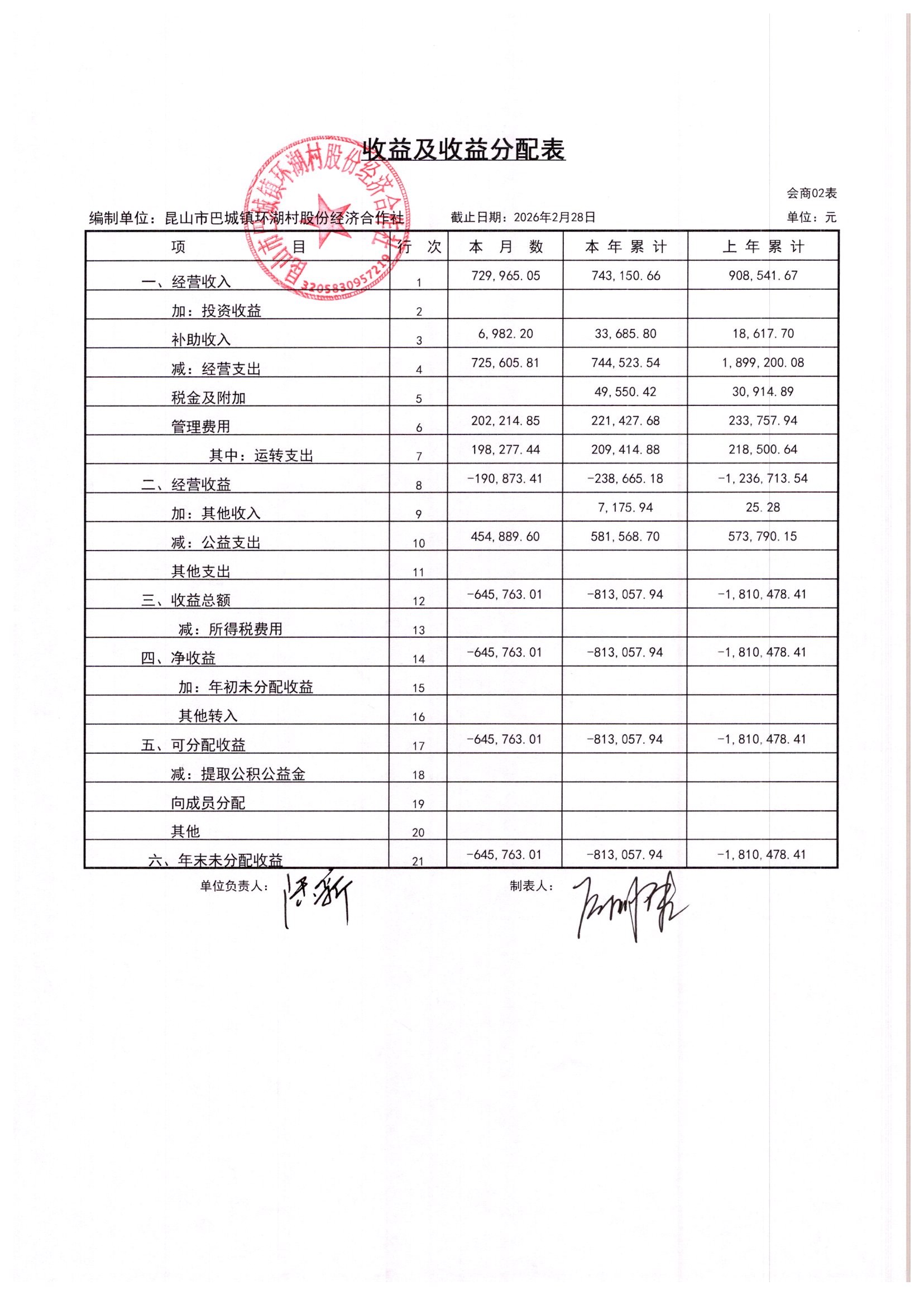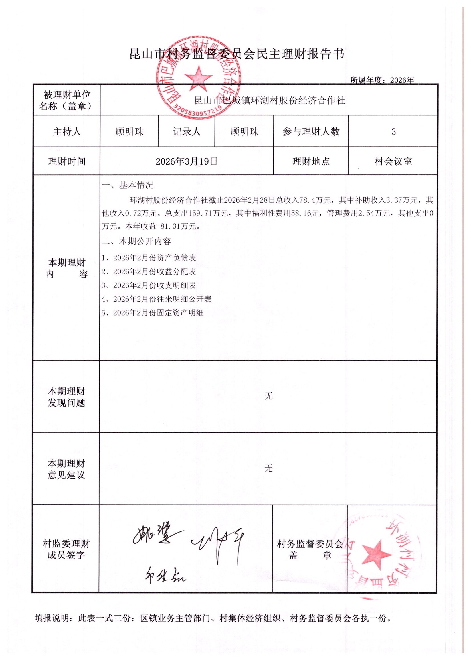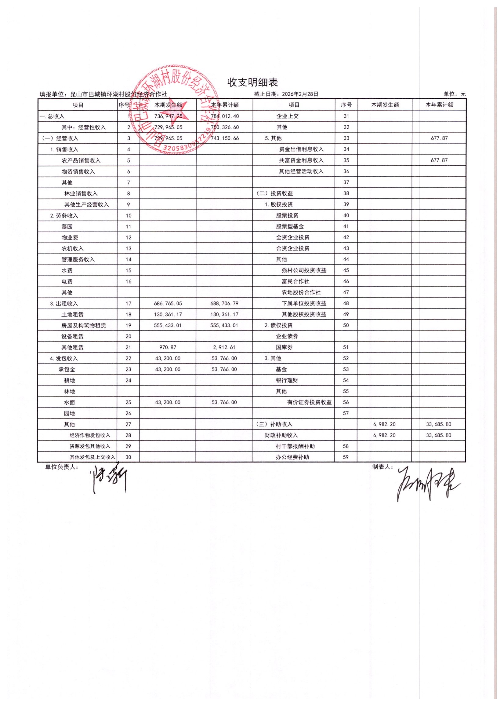 2026年2月环湖村股份经济合作社财务公开