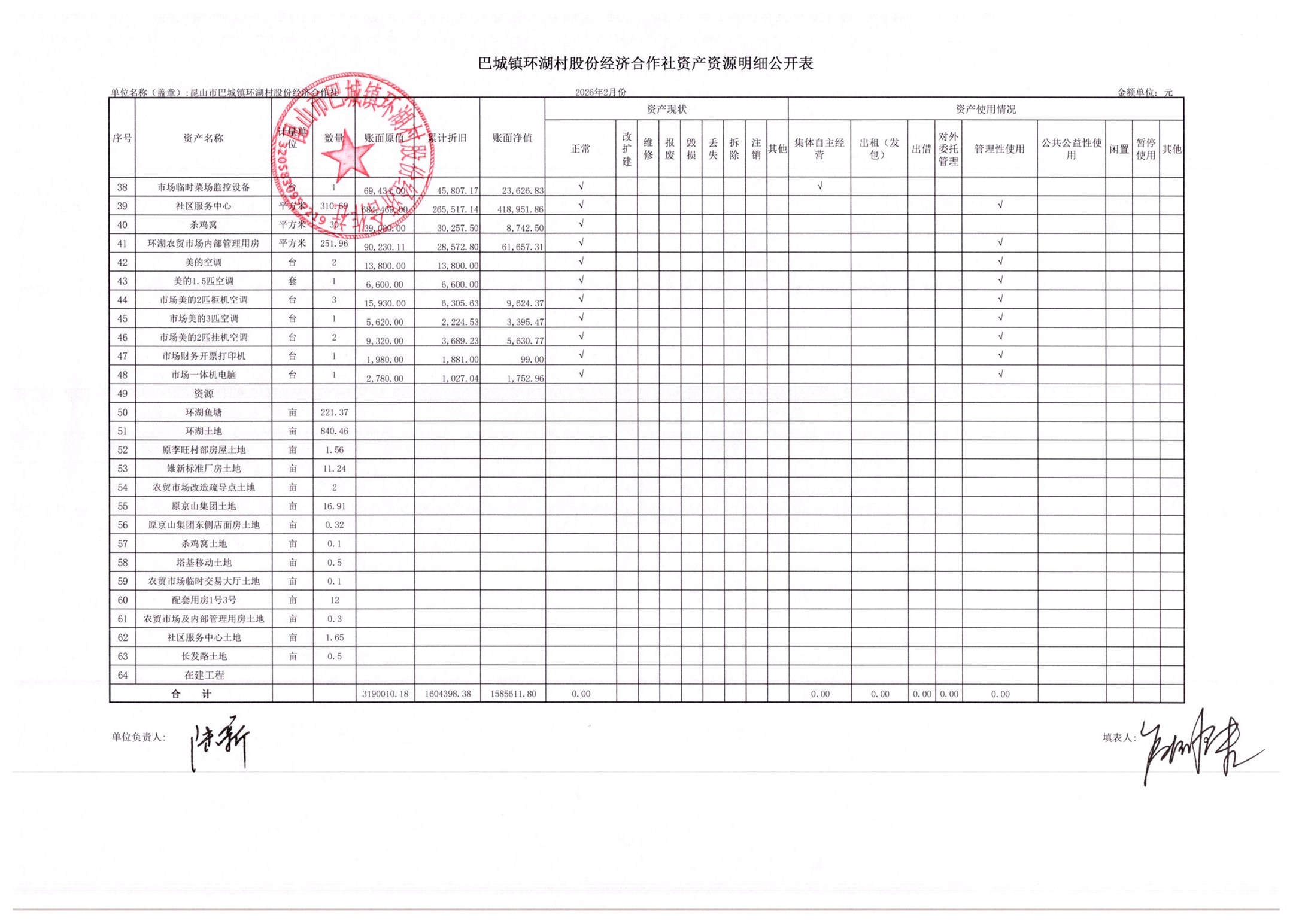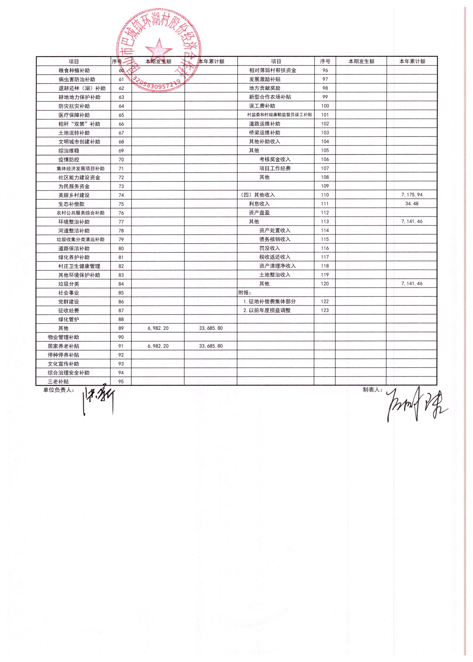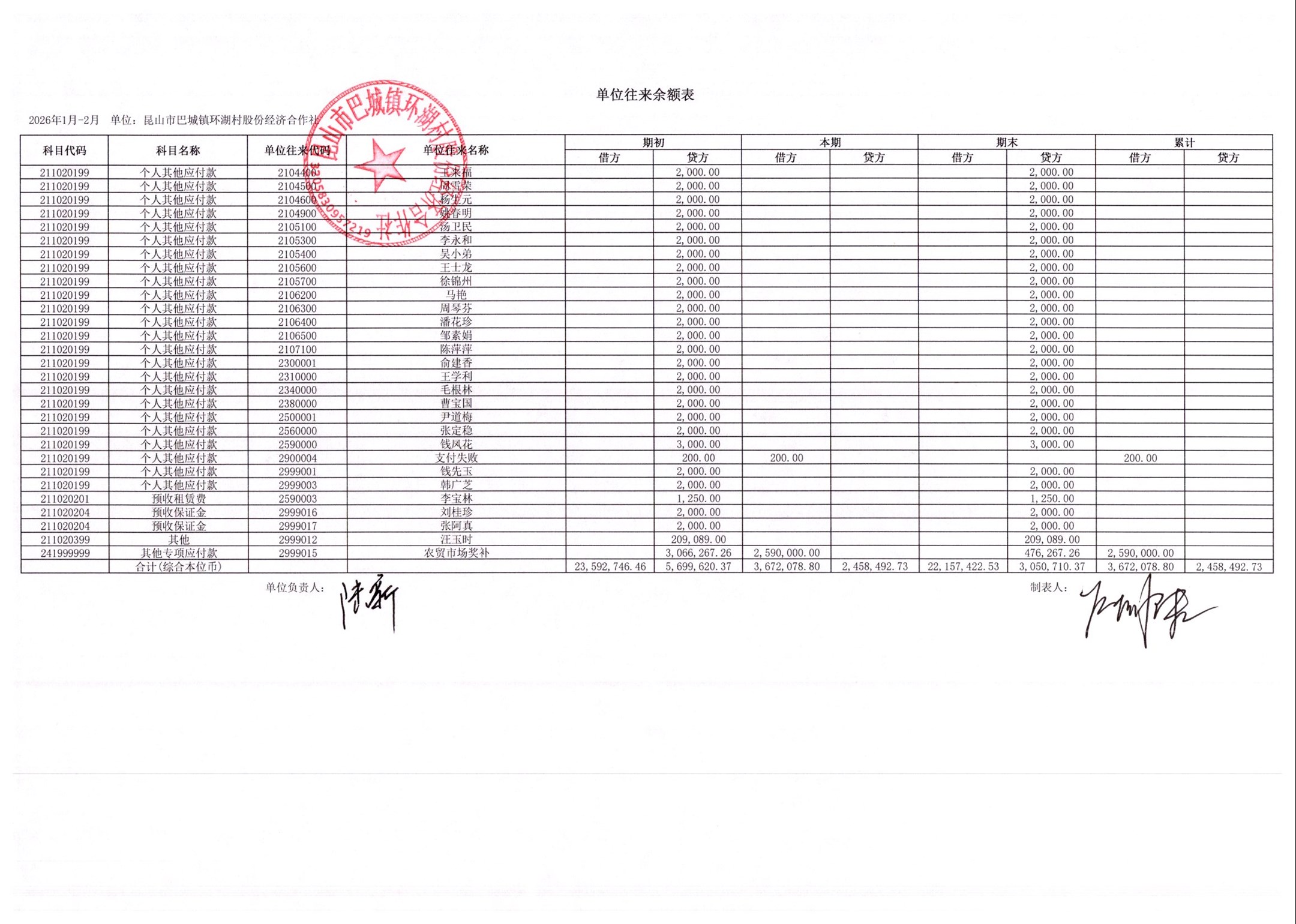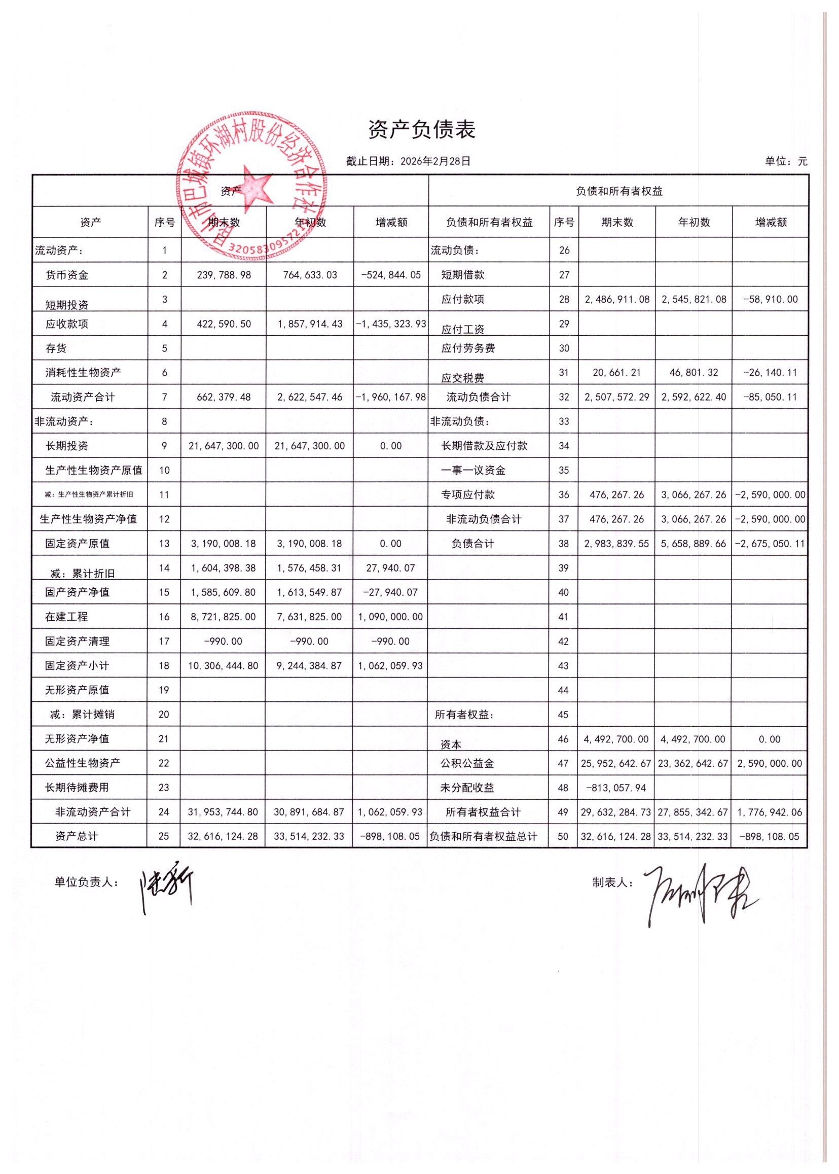 2026年2月环湖村股份经济合作社财务公开