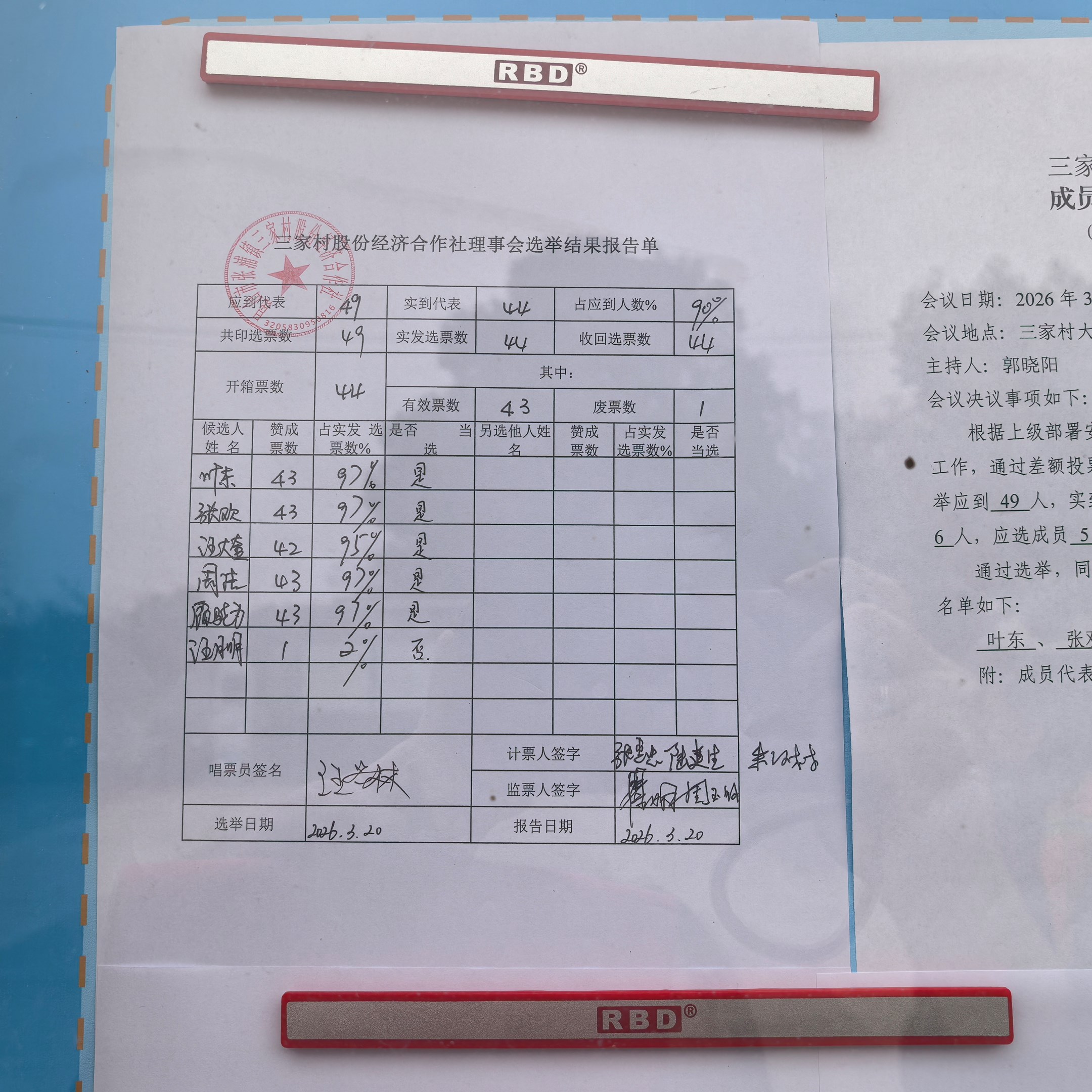 三家村股份经济合作社换届选举理事会计票结果报告单