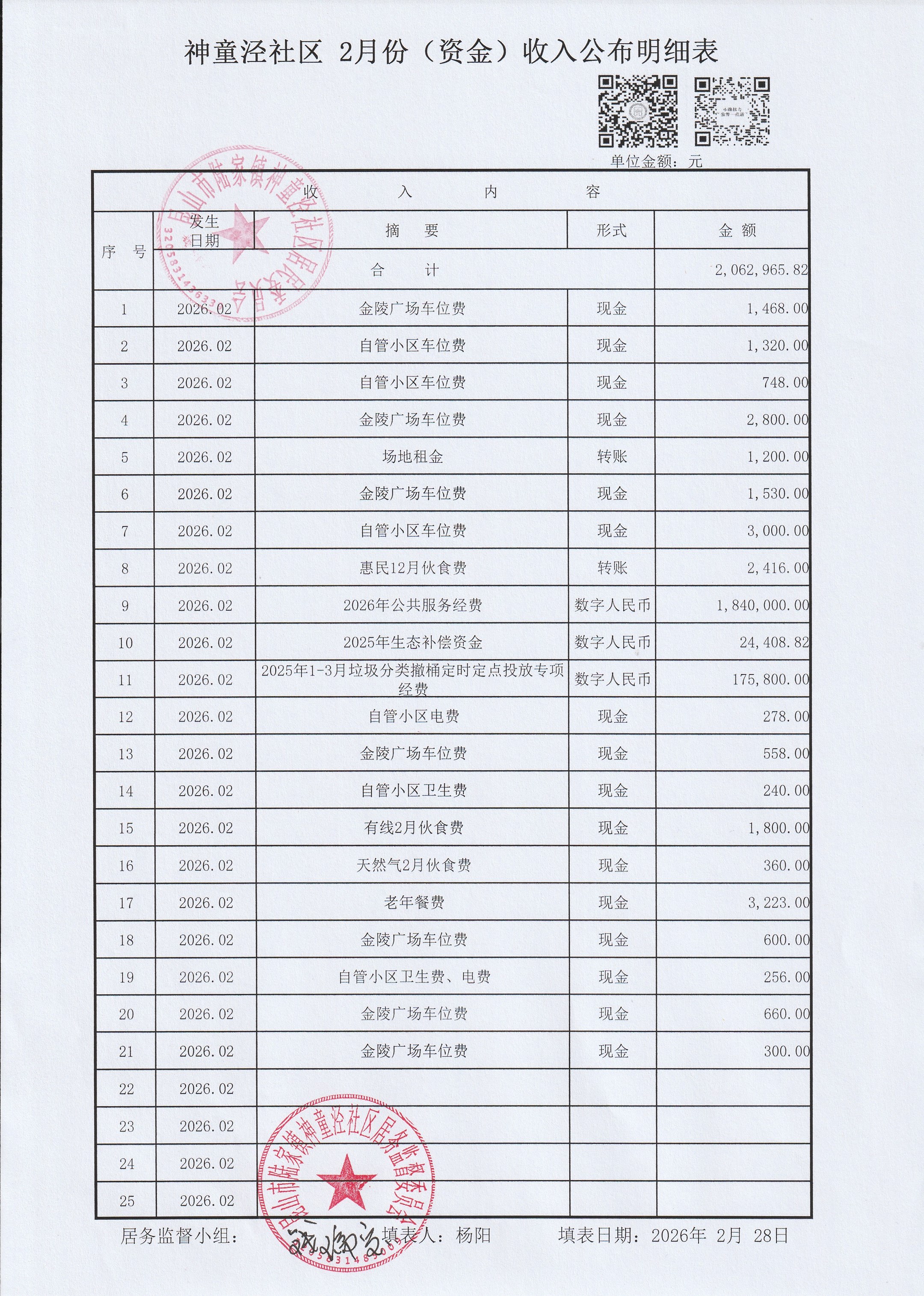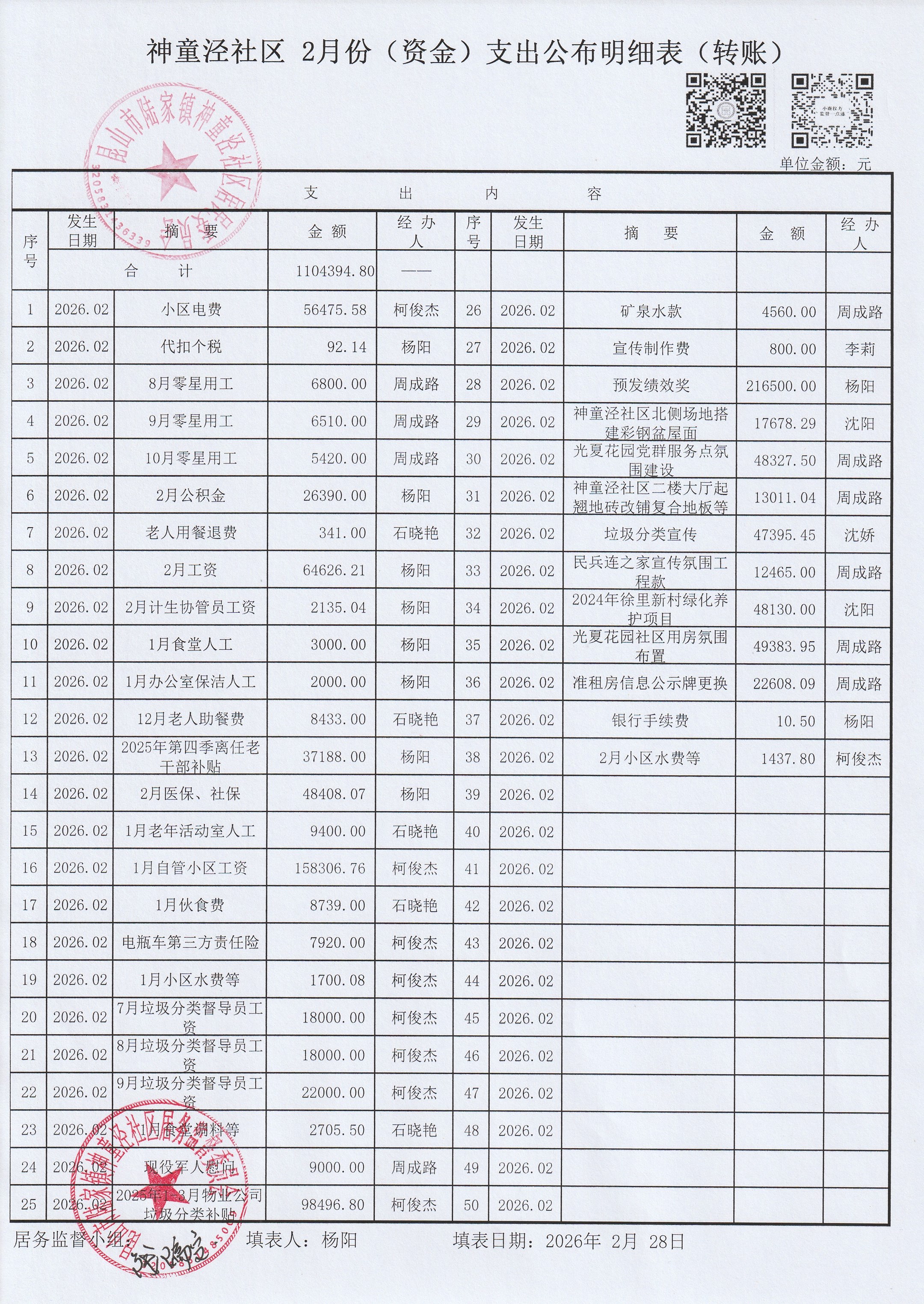 神童泾社区居民委员会2月份(资金)收支公布明