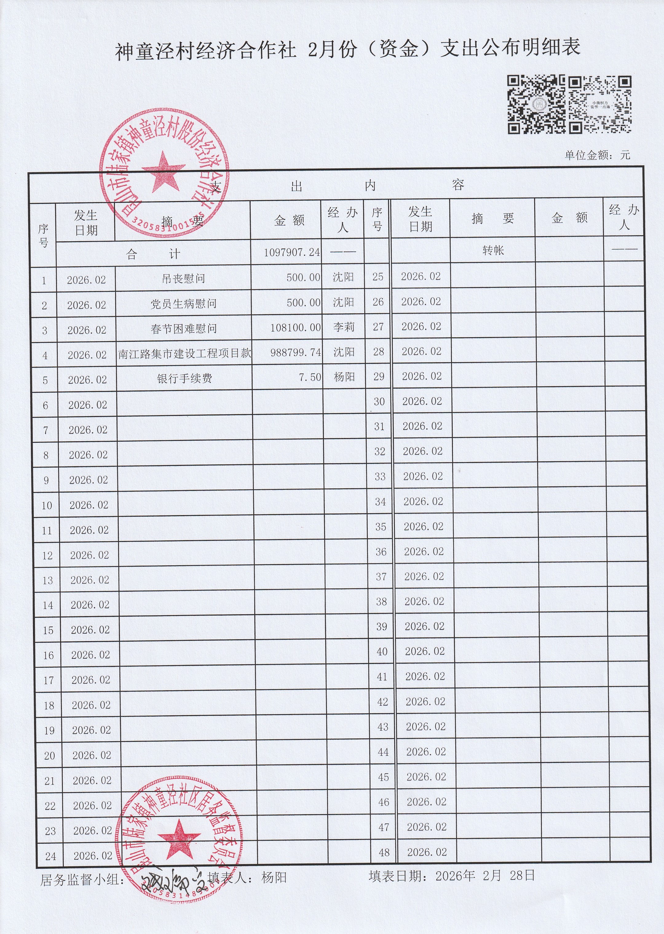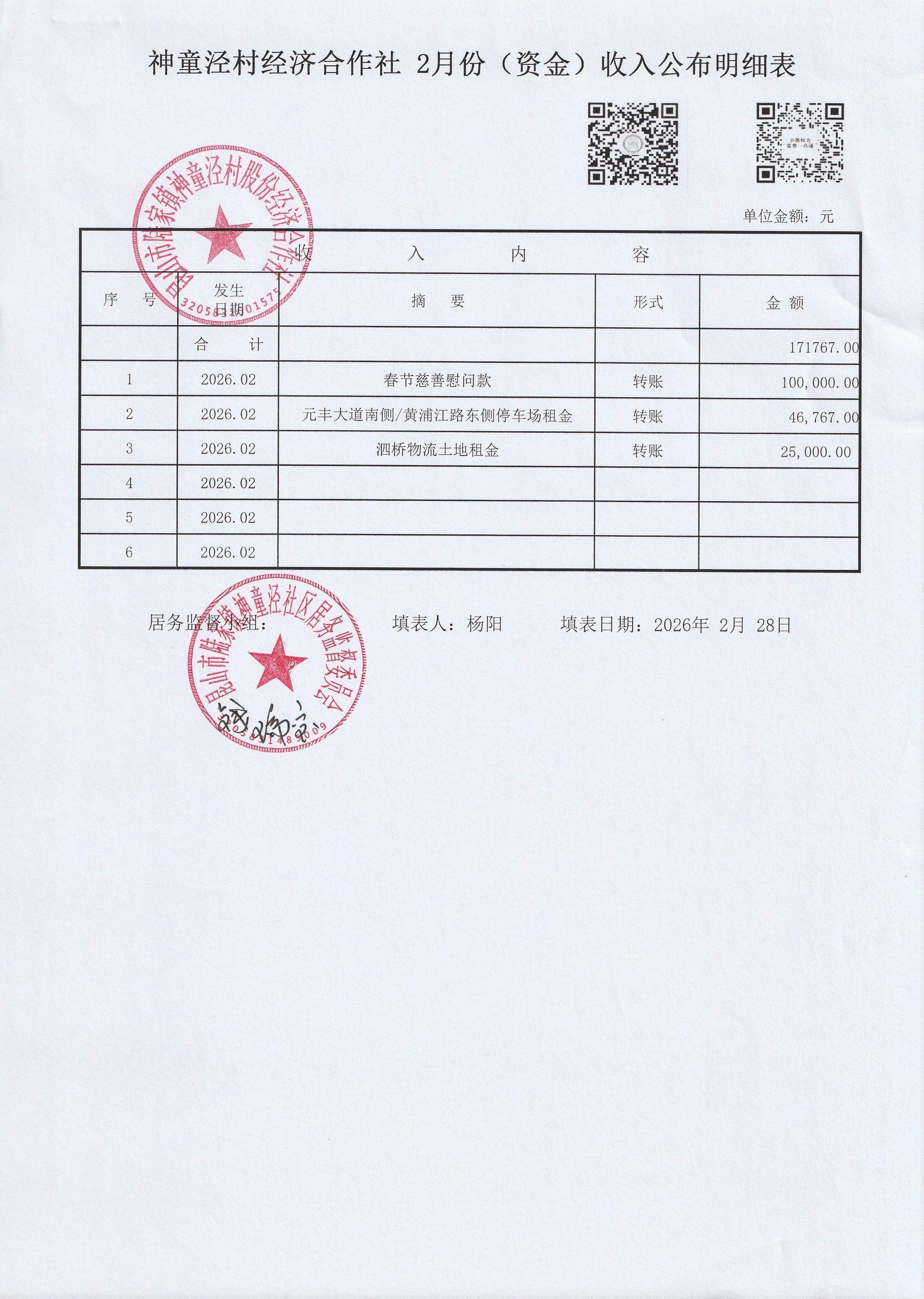神童泾村股份经济合作社2月份(资金)收支公布明细表
