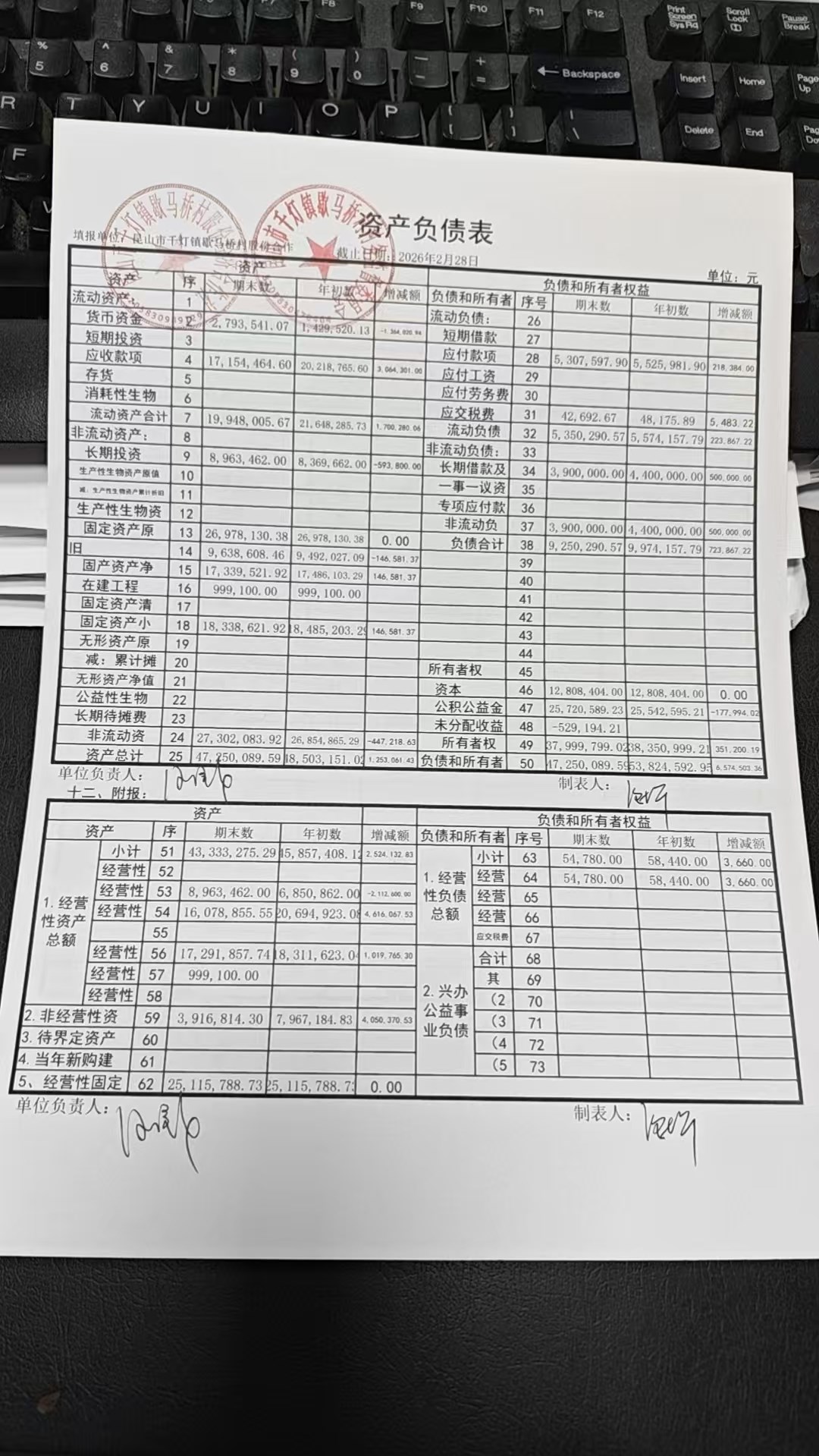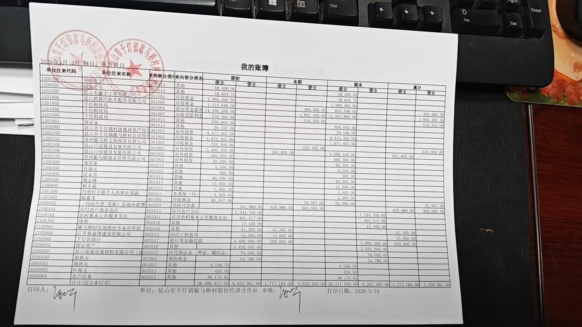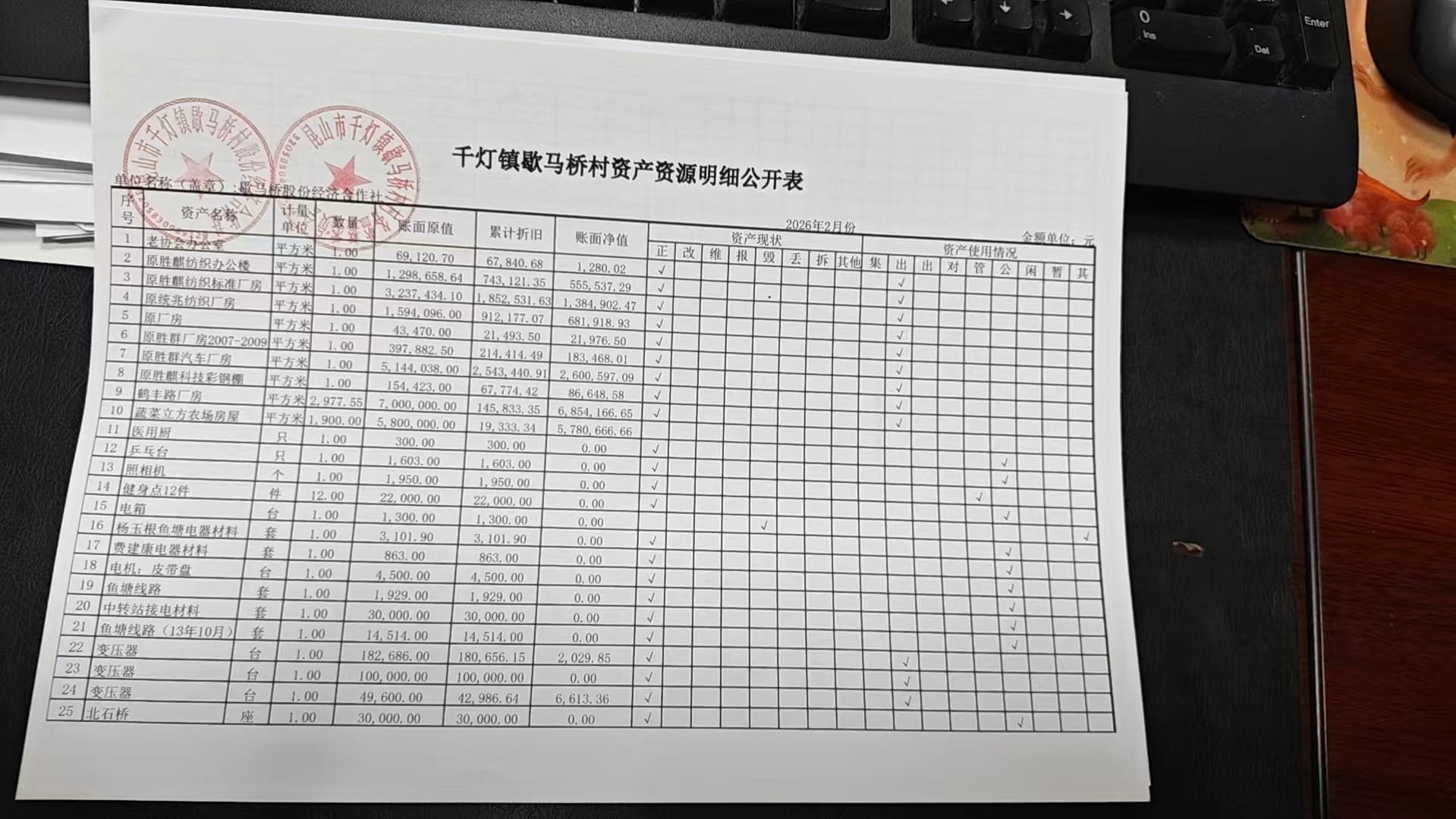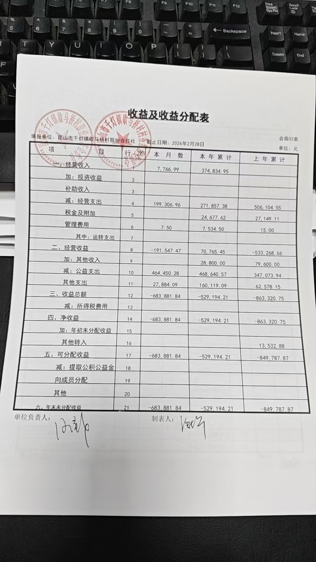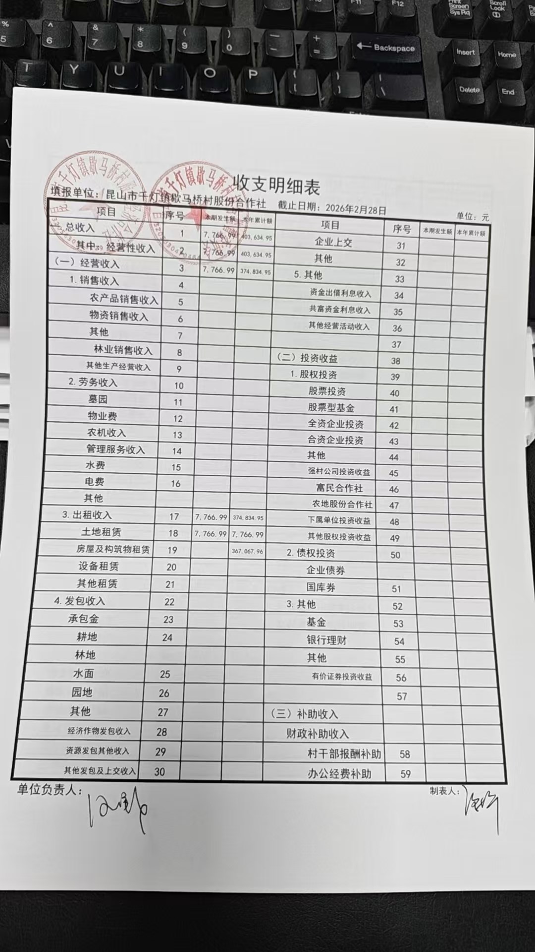 2026年2月份歇马桥村股份经济合作社财务公开