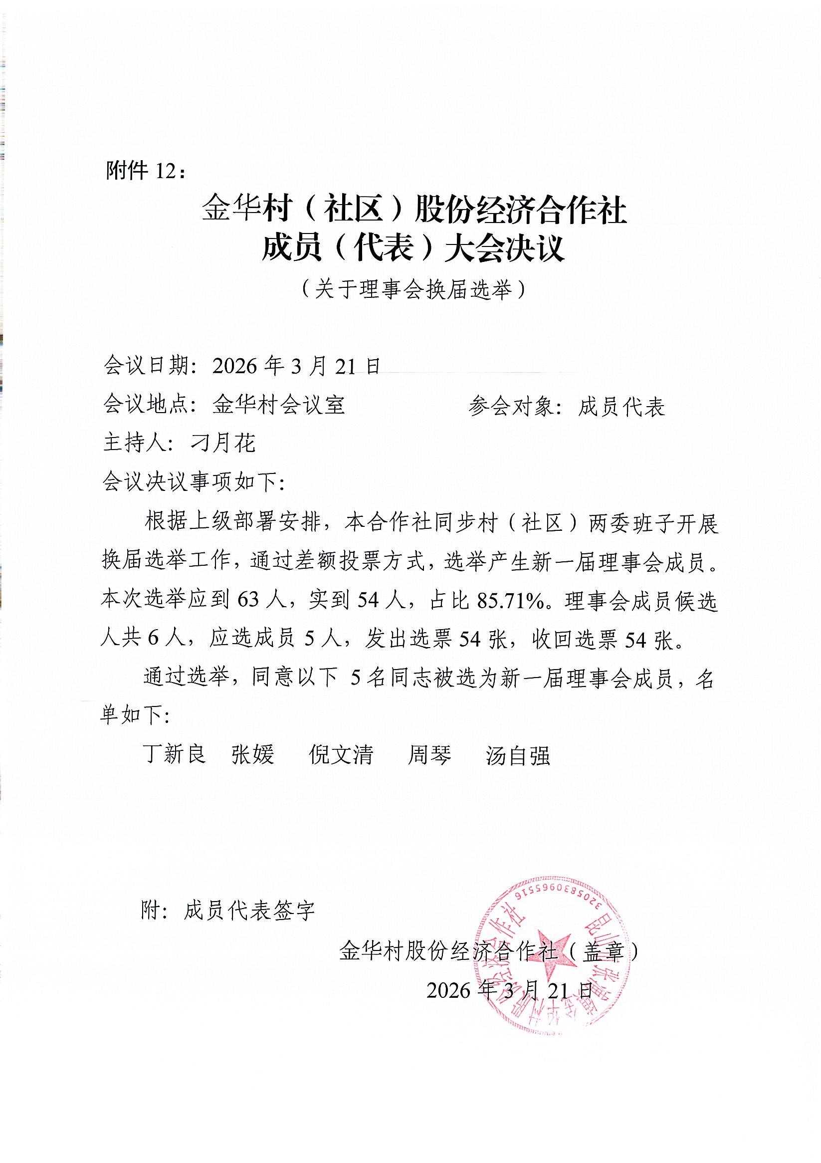 金华村股份经济合作社成员代表大会决议(关于理事会换届选举)
