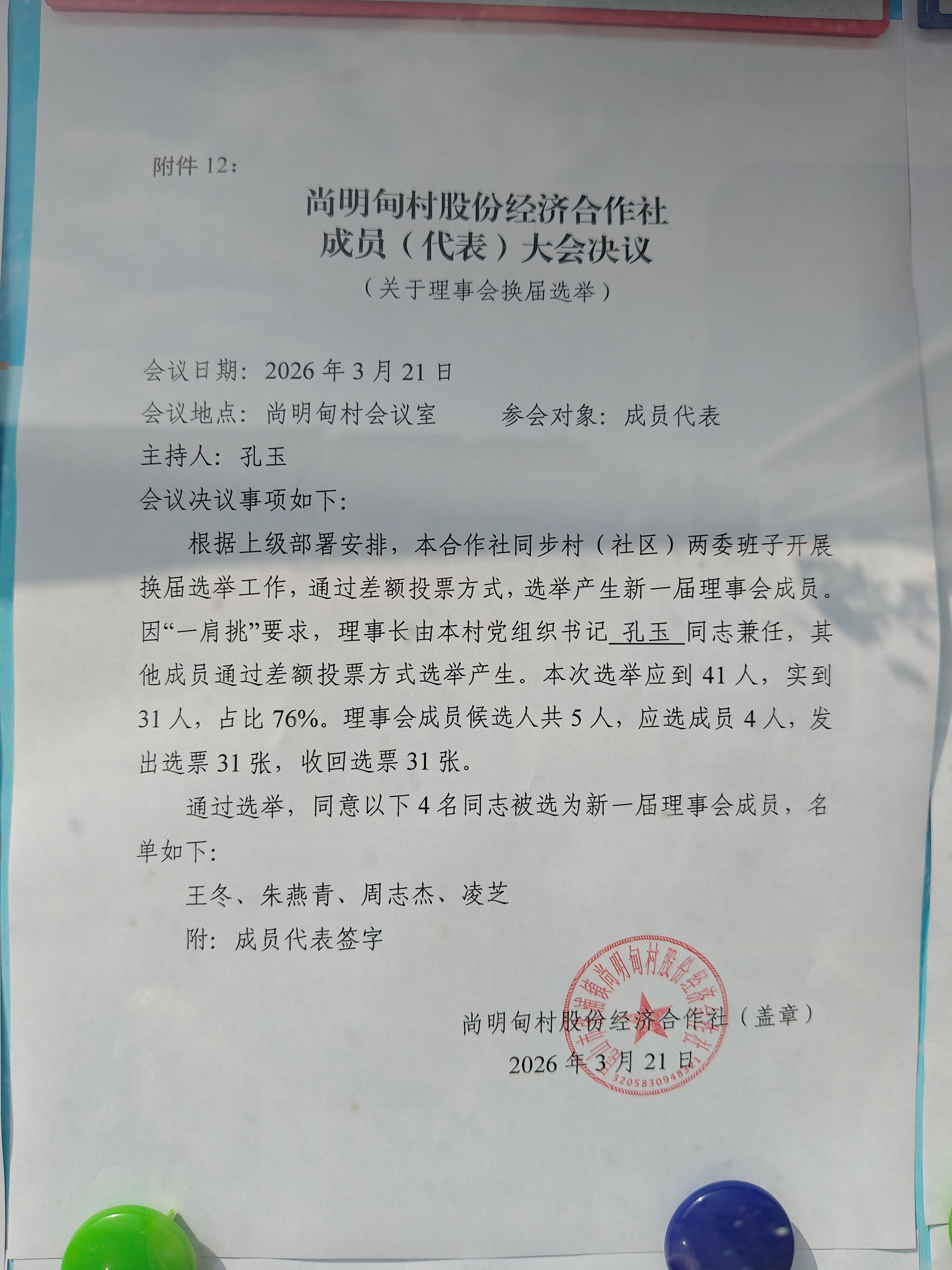 尚明甸村股份经济合作社成员代表大会决议(关于理事会换届选举)