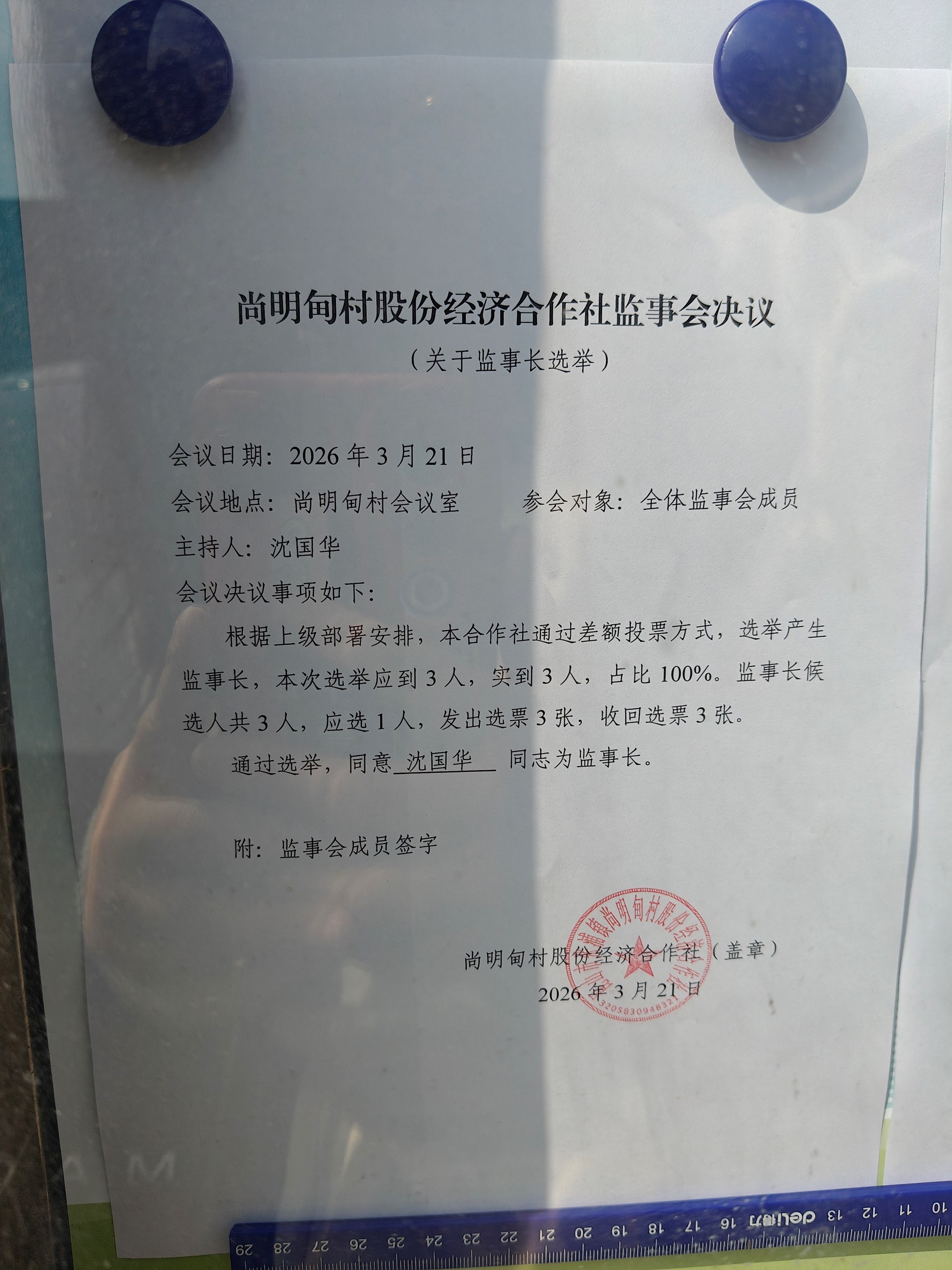 尚明甸村股份经济合作社监事会决议(关于监事长选举)