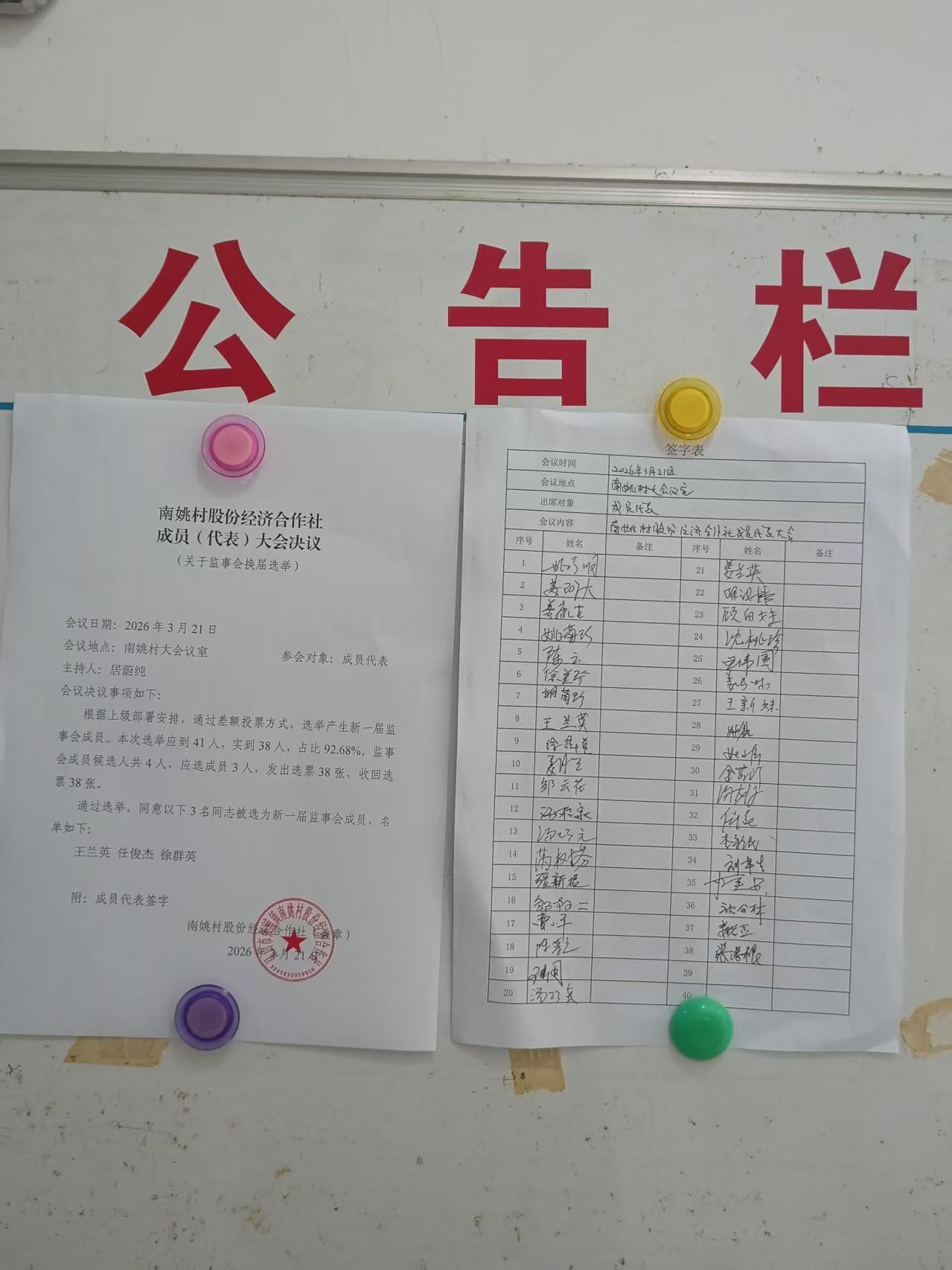 南姚村股份经济合作社监事会换届选举成员代表大会决议