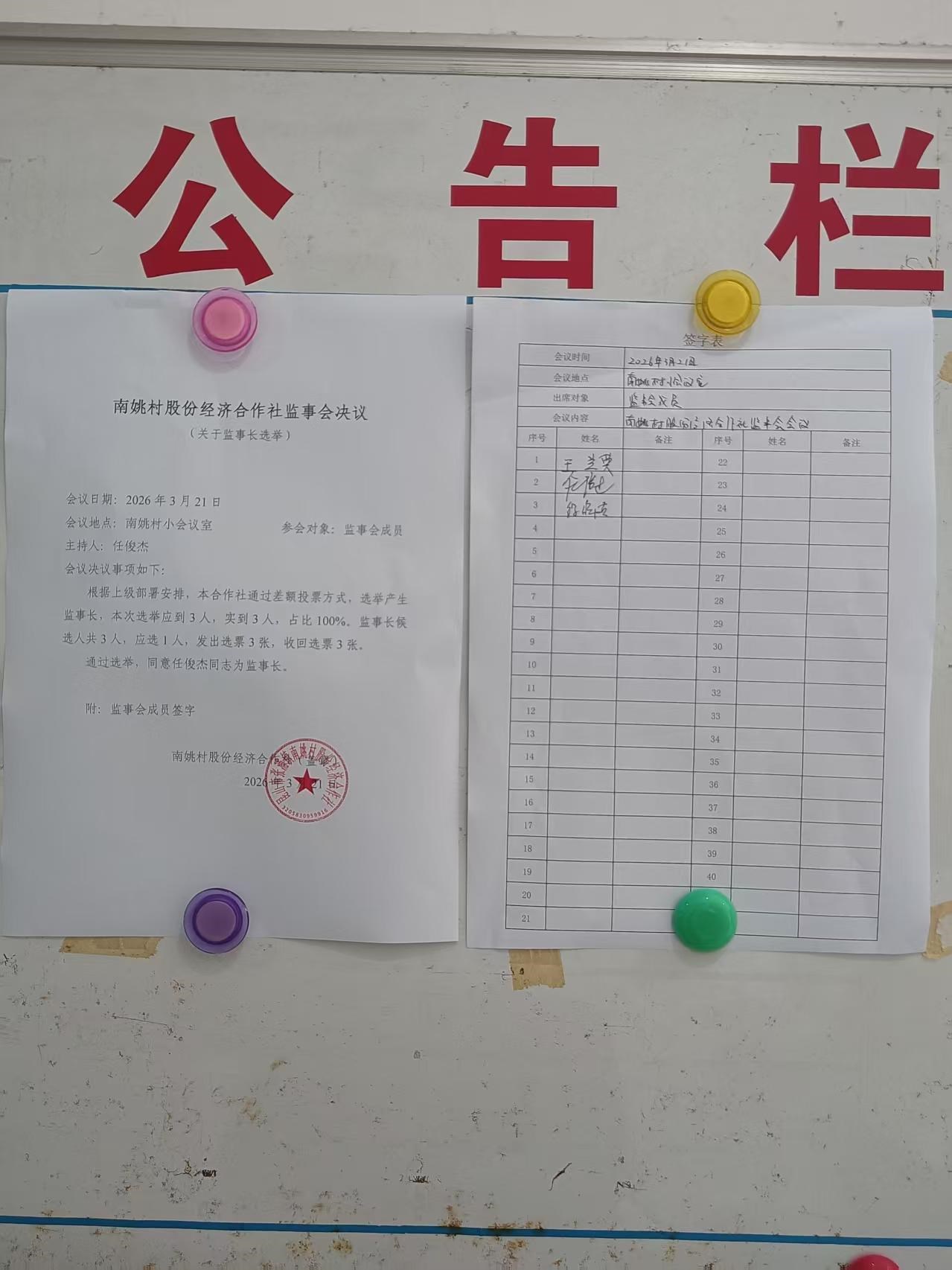 南姚村股份经济合作社监事会选举监事长决议公示