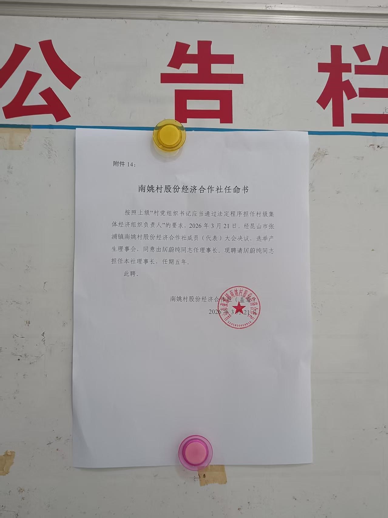 南姚村股份经济合作社理事长任命书公示