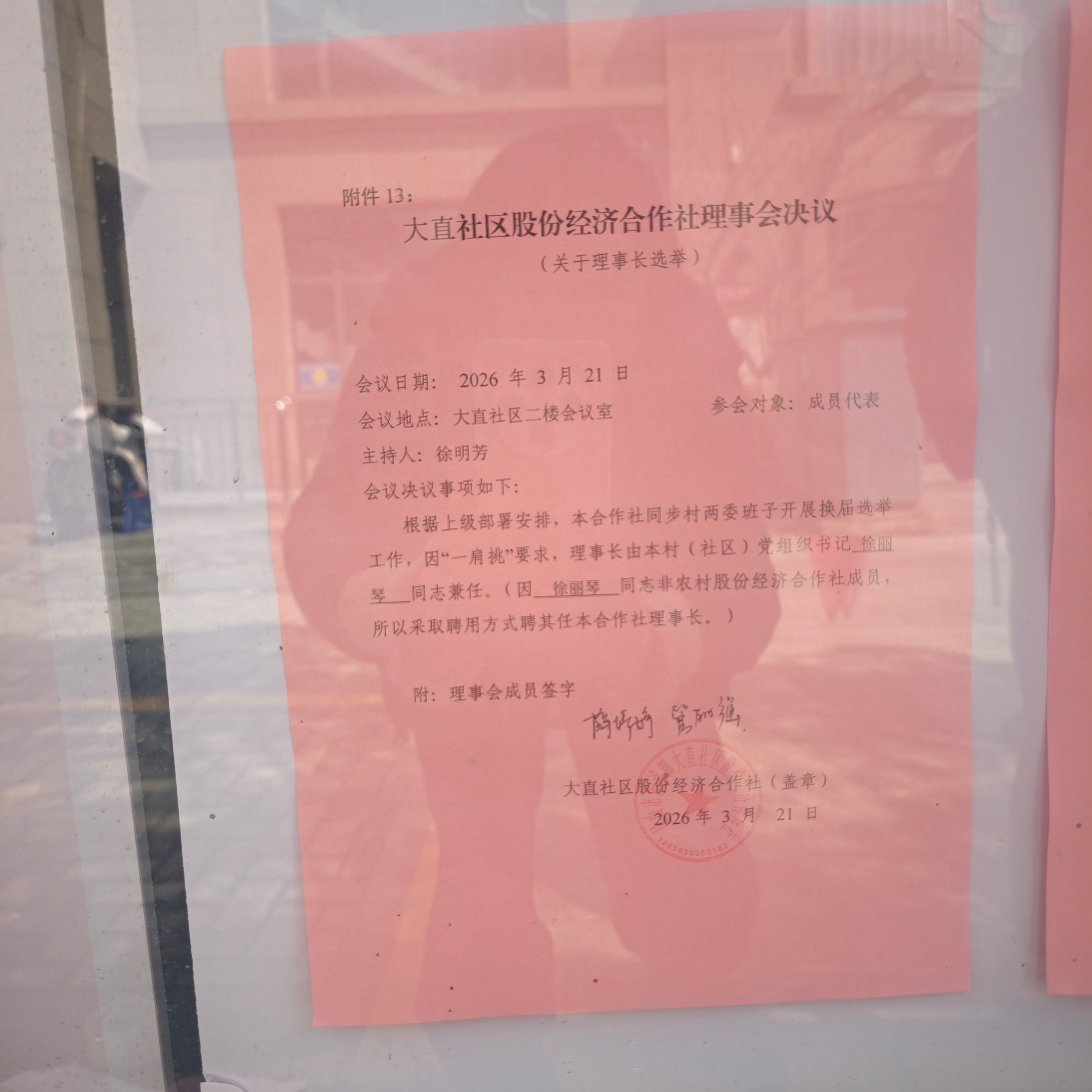 大直社区股份经济合作社理事会决议(聘用党组织书记任理事长)公示