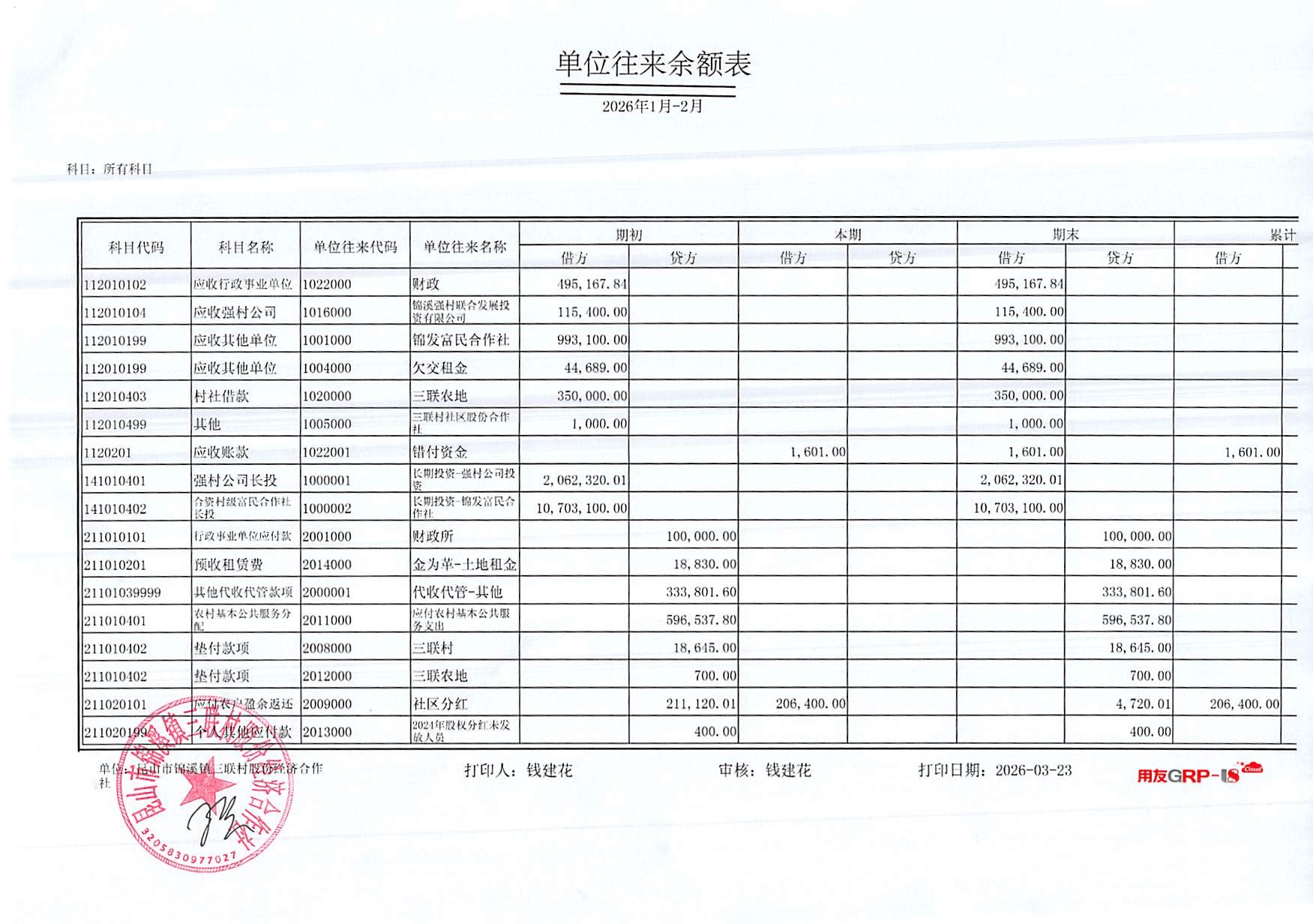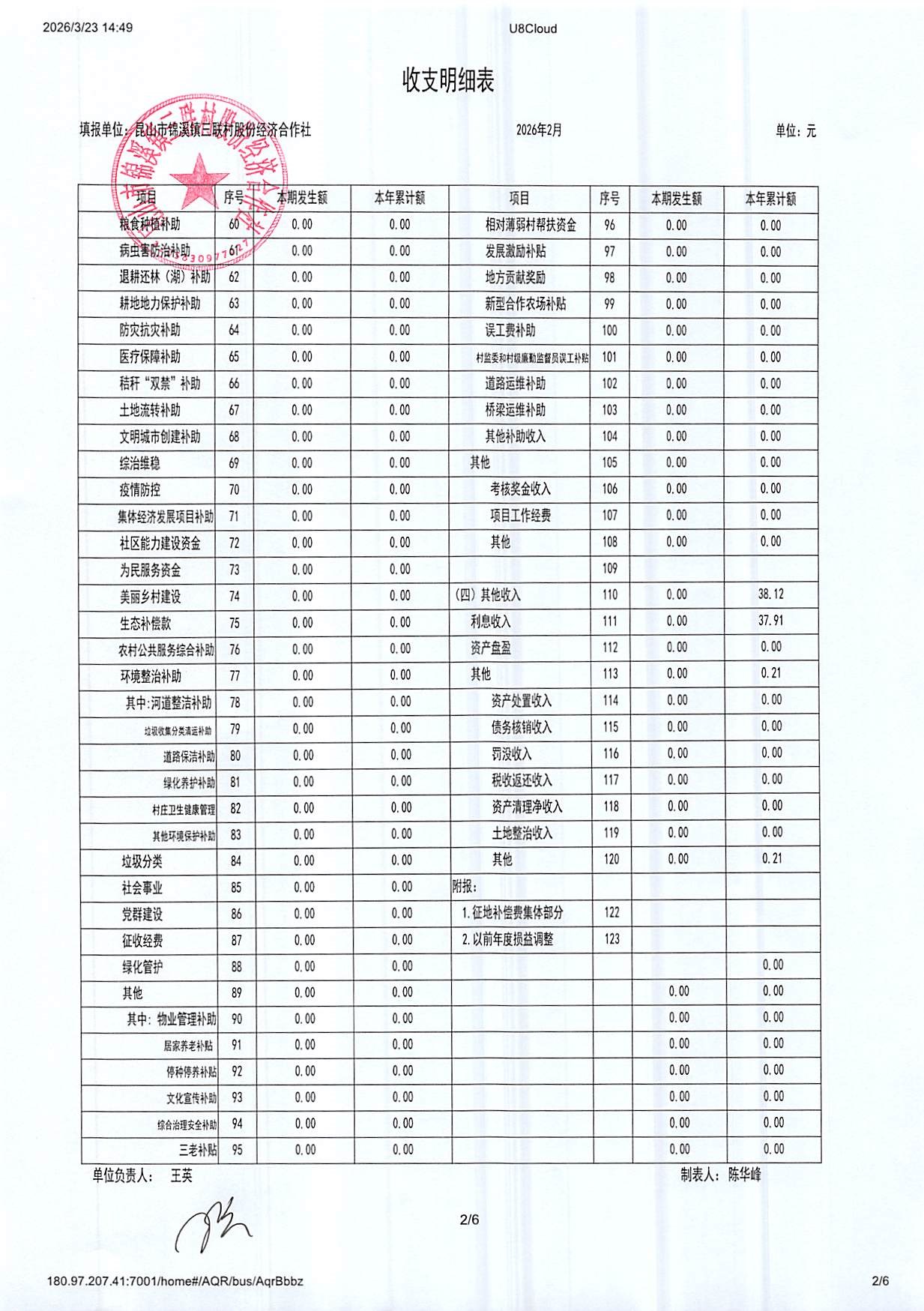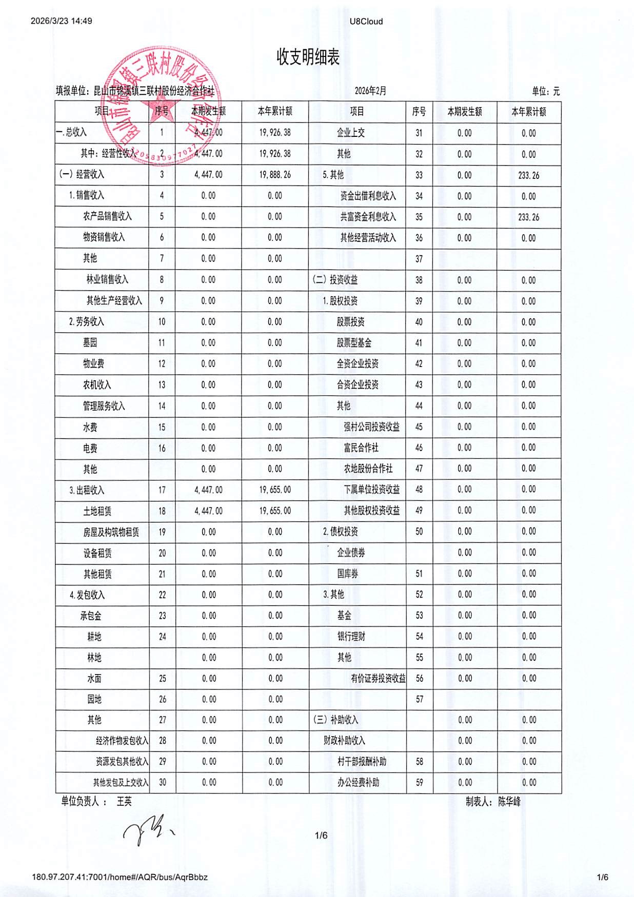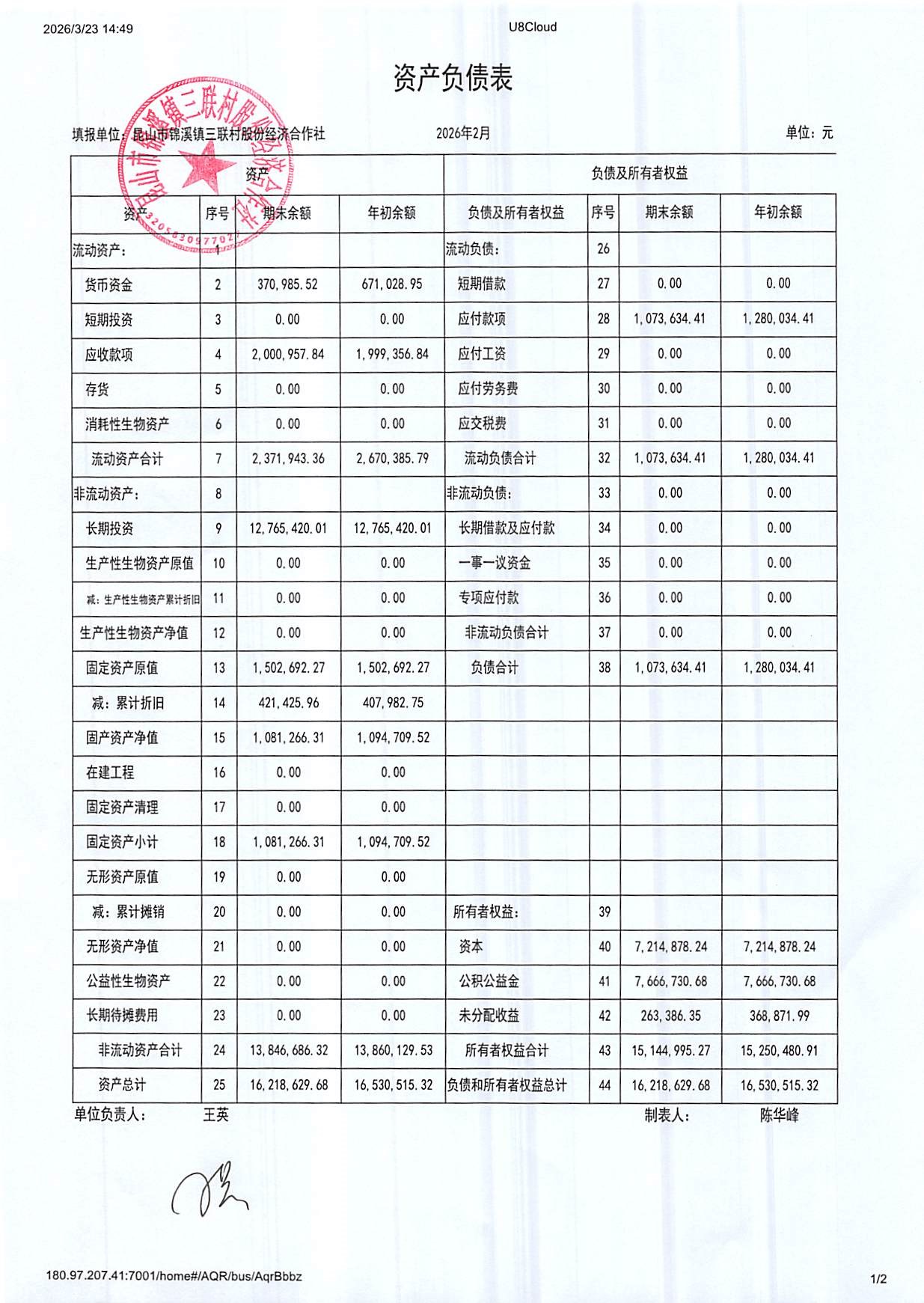 2026年三联村股份经济合作社2月份财务公开
