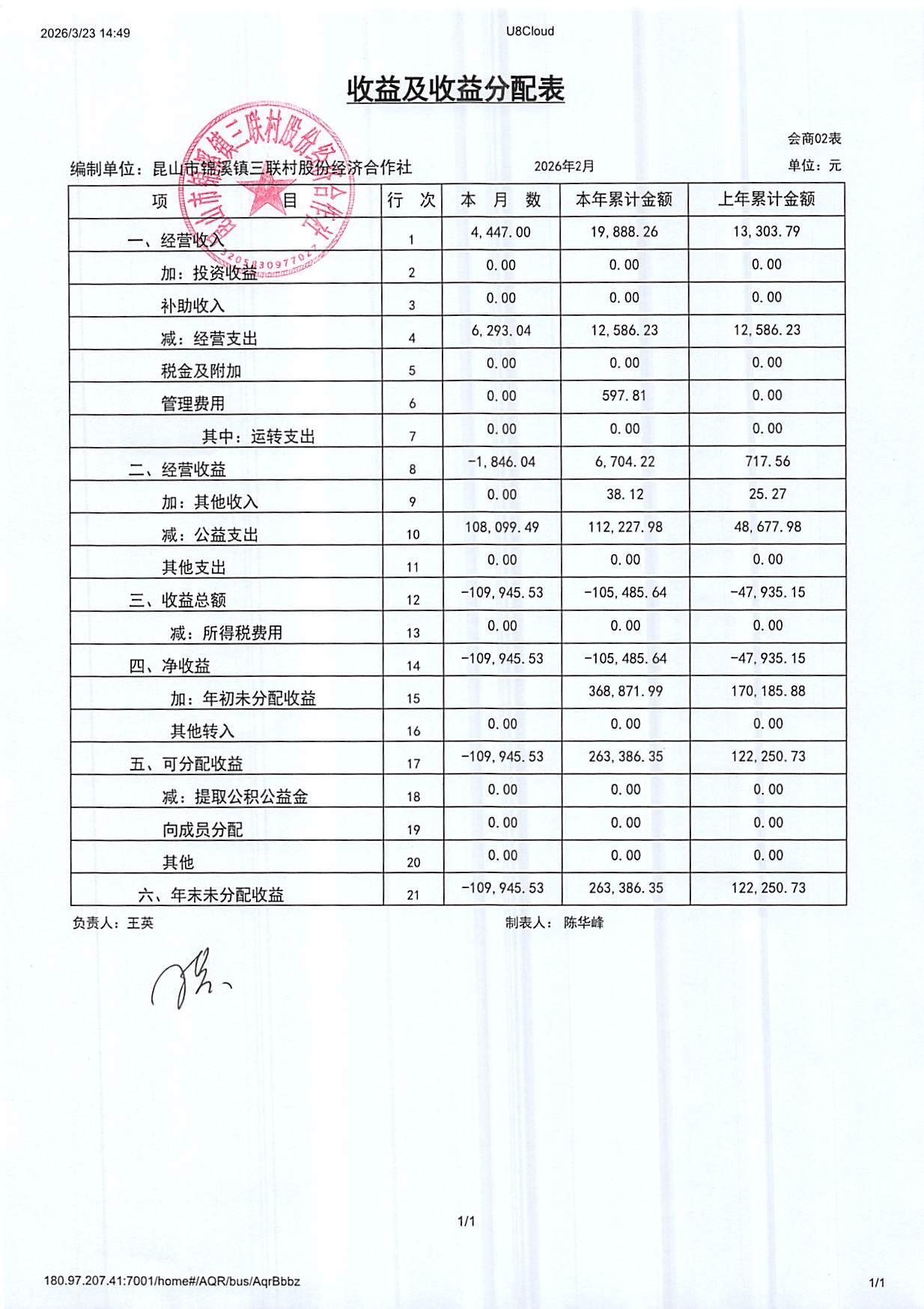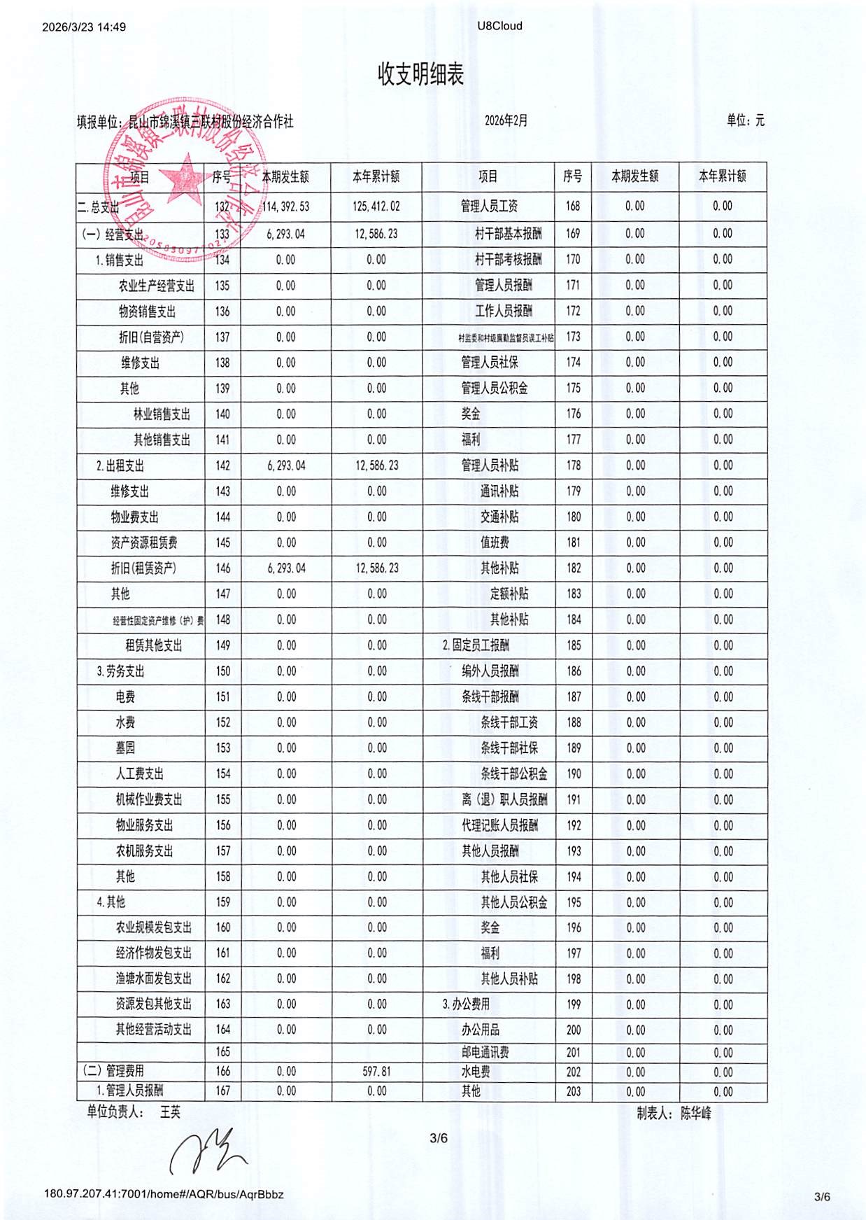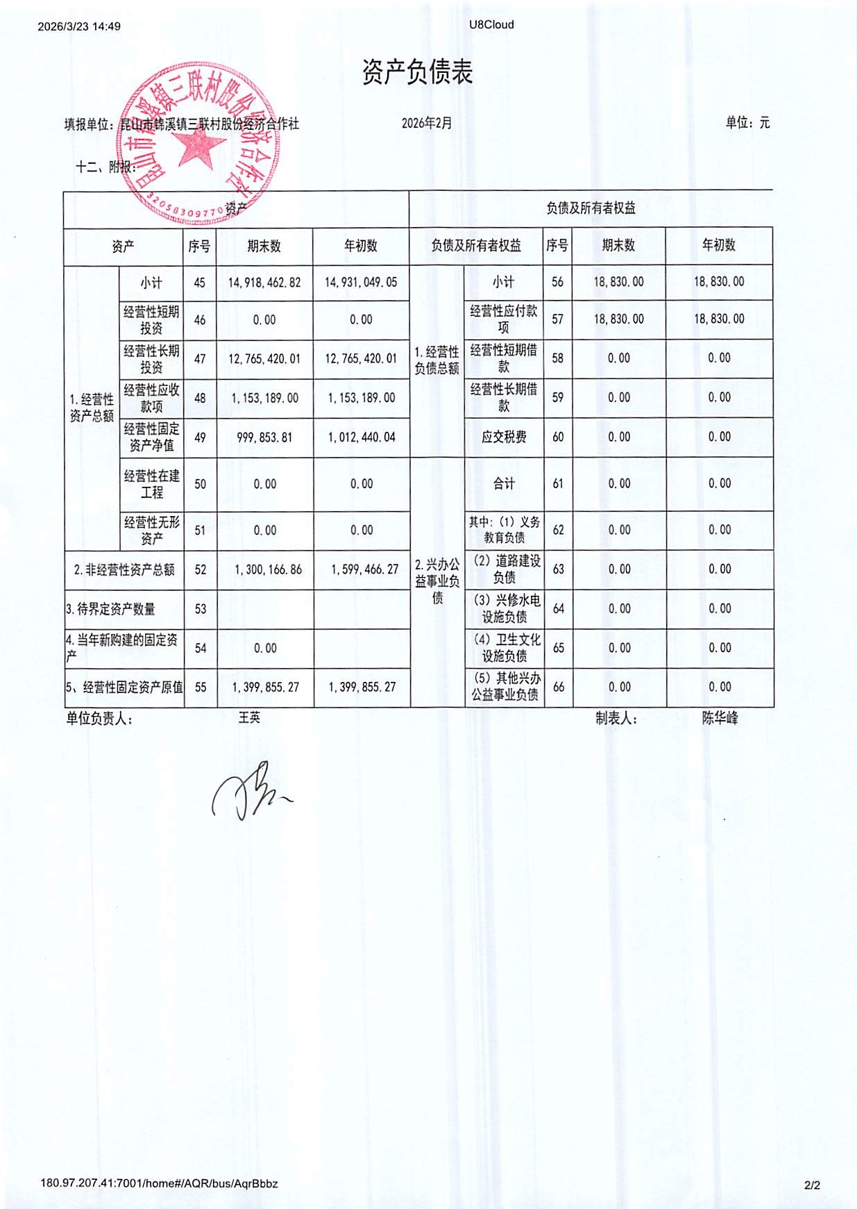 2026年三联村股份经济合作社2月份财务公开