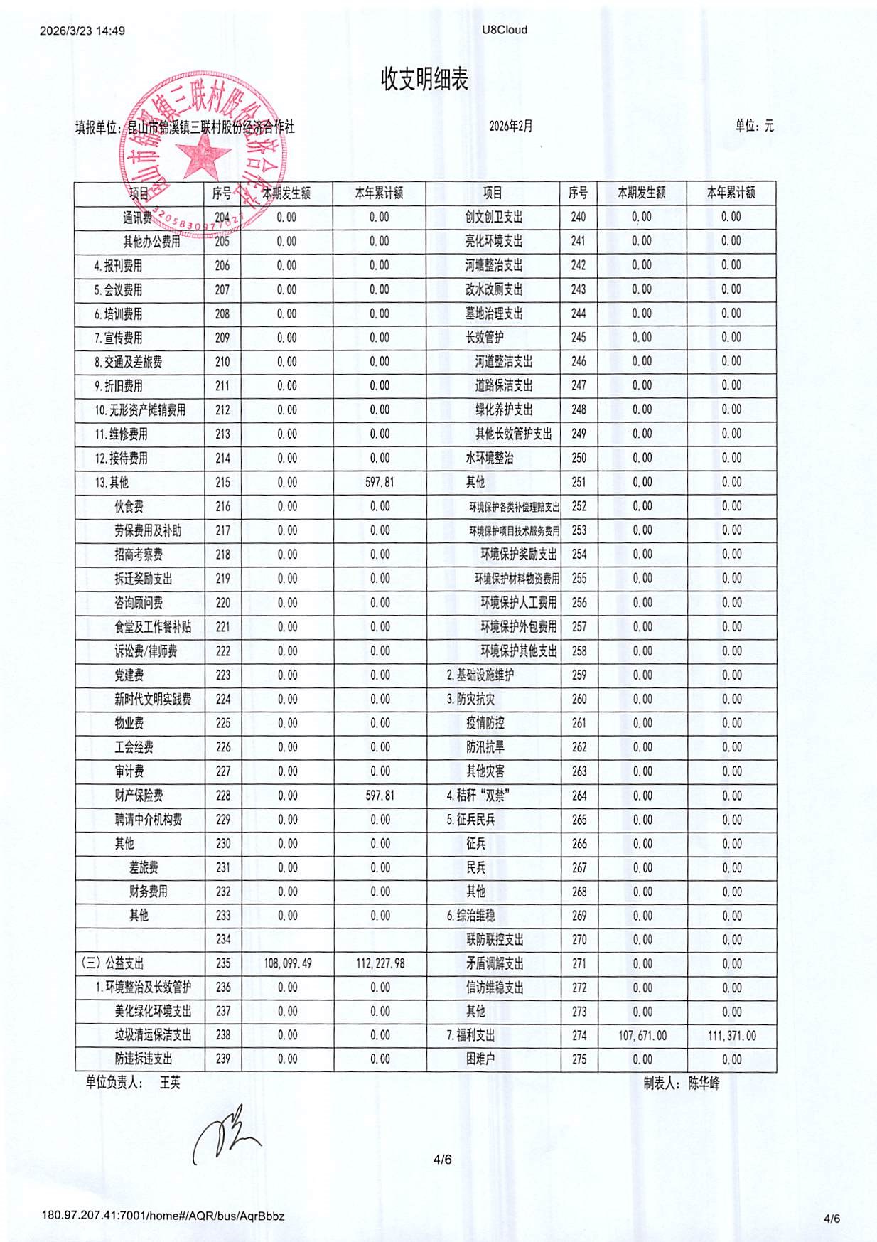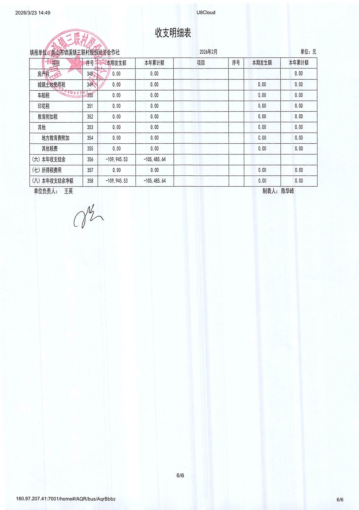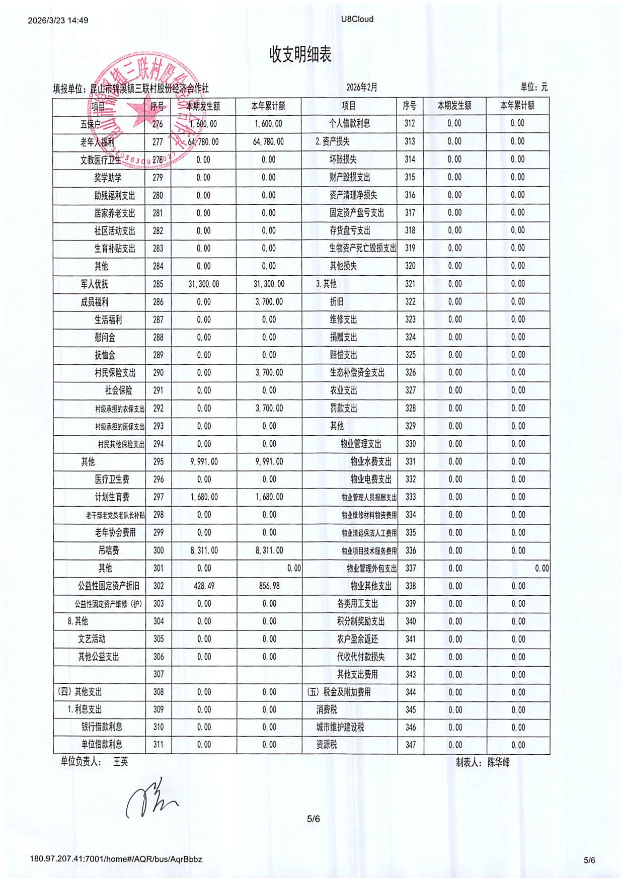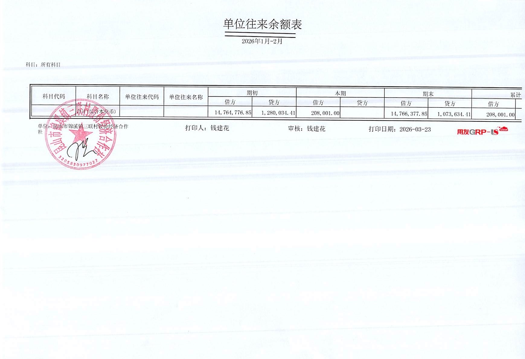 2026年三联村股份经济合作社2月份财务公开