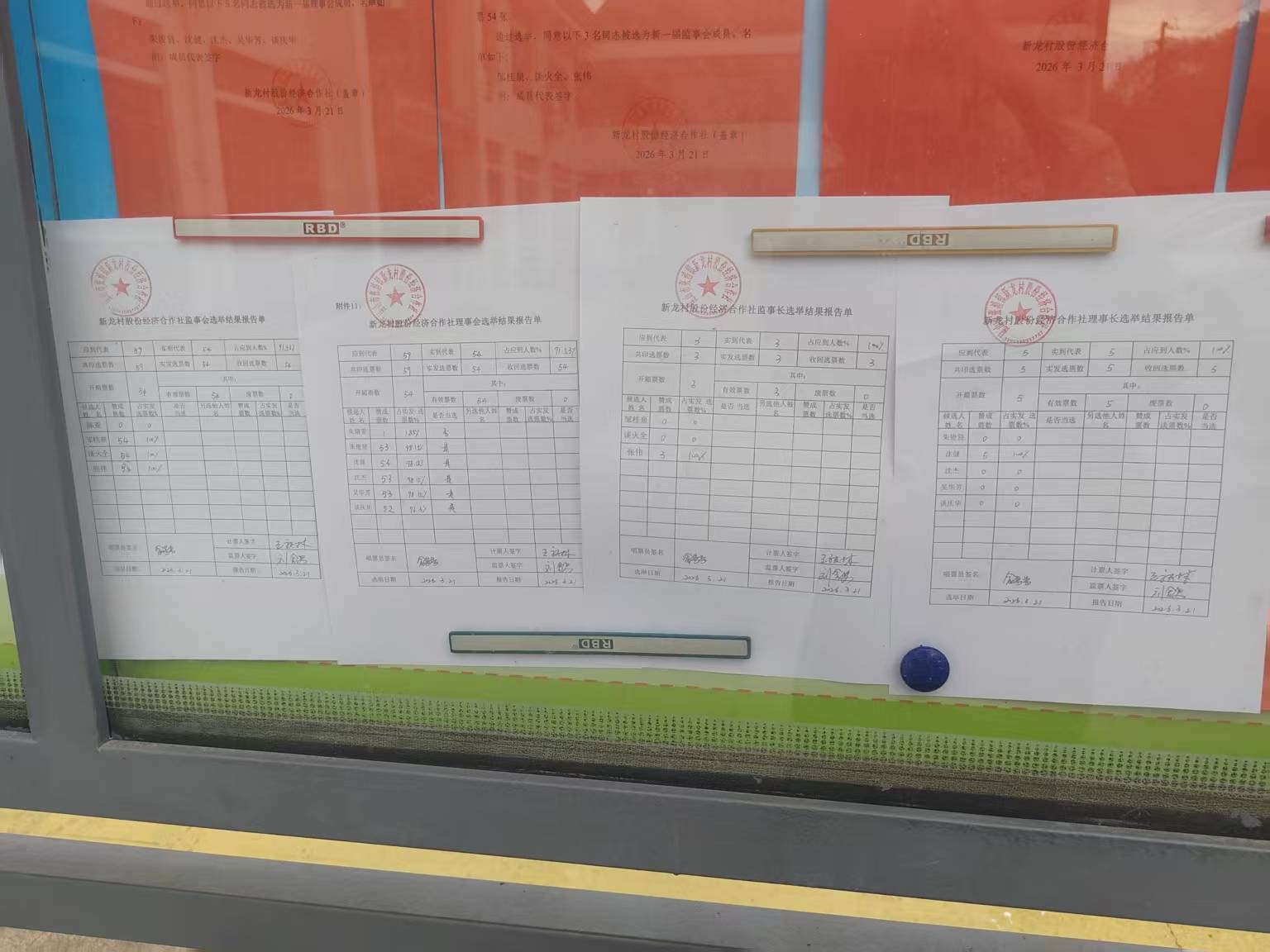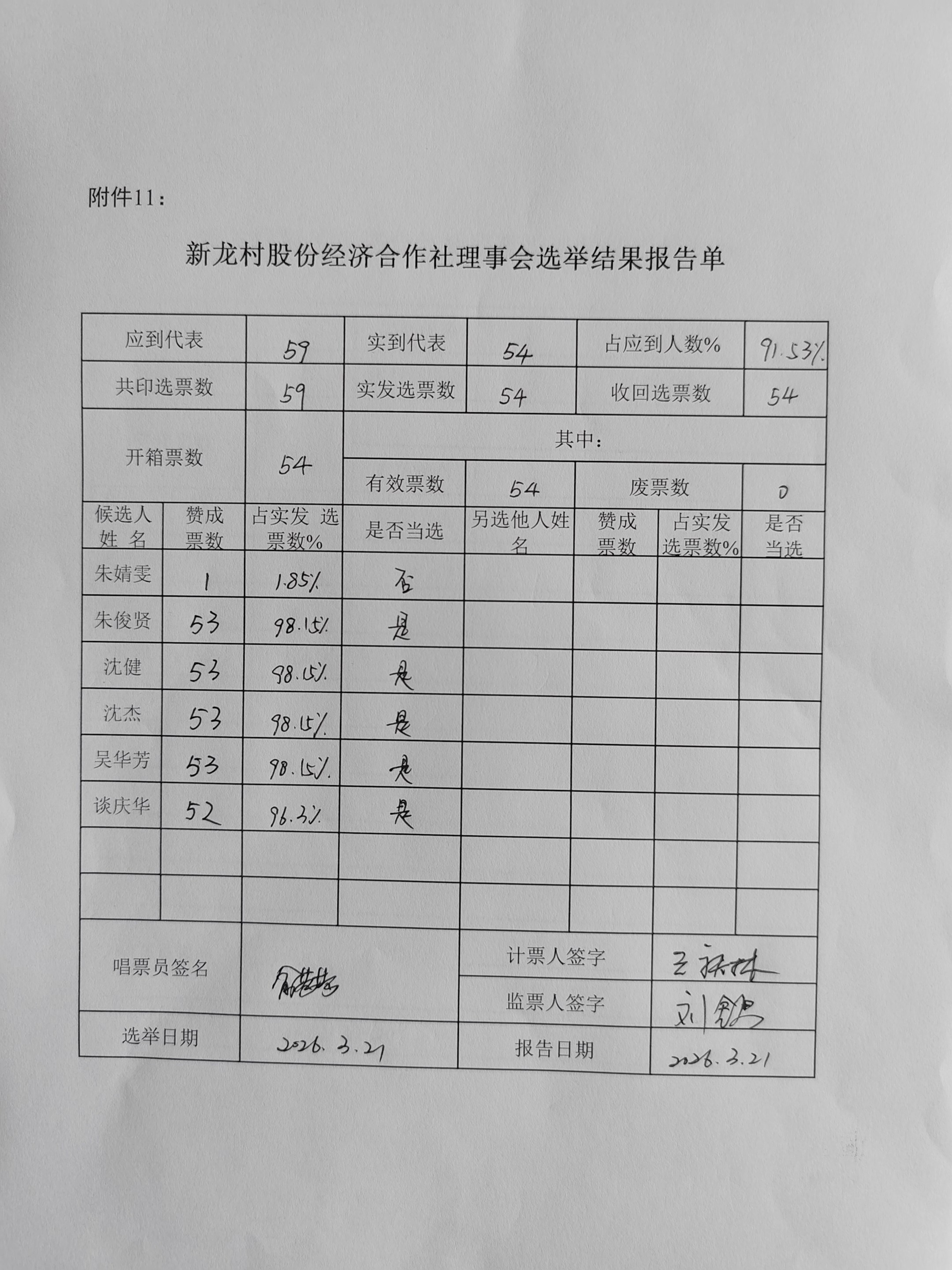 新龙村股份经济合作社理事会选举结果报告单