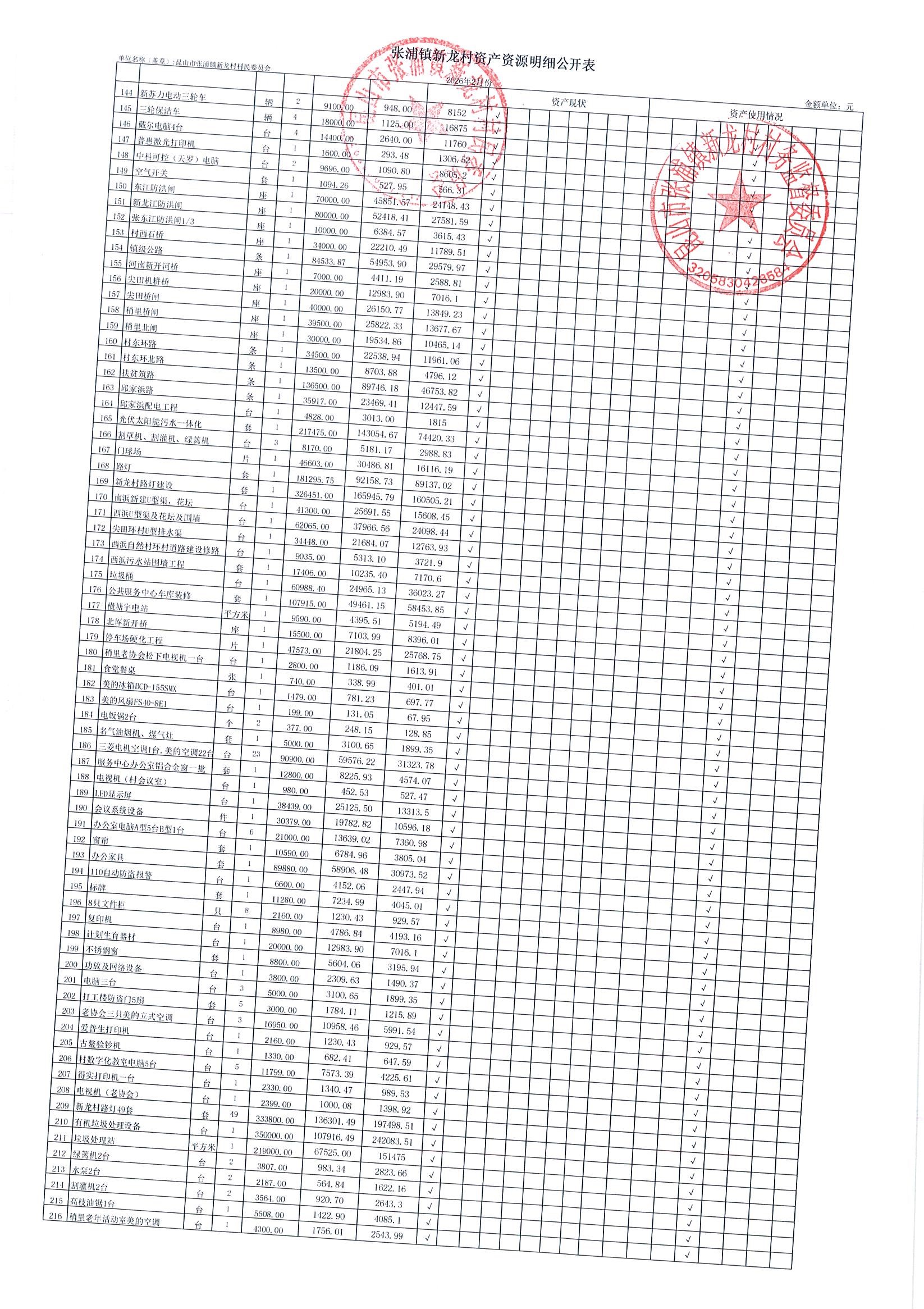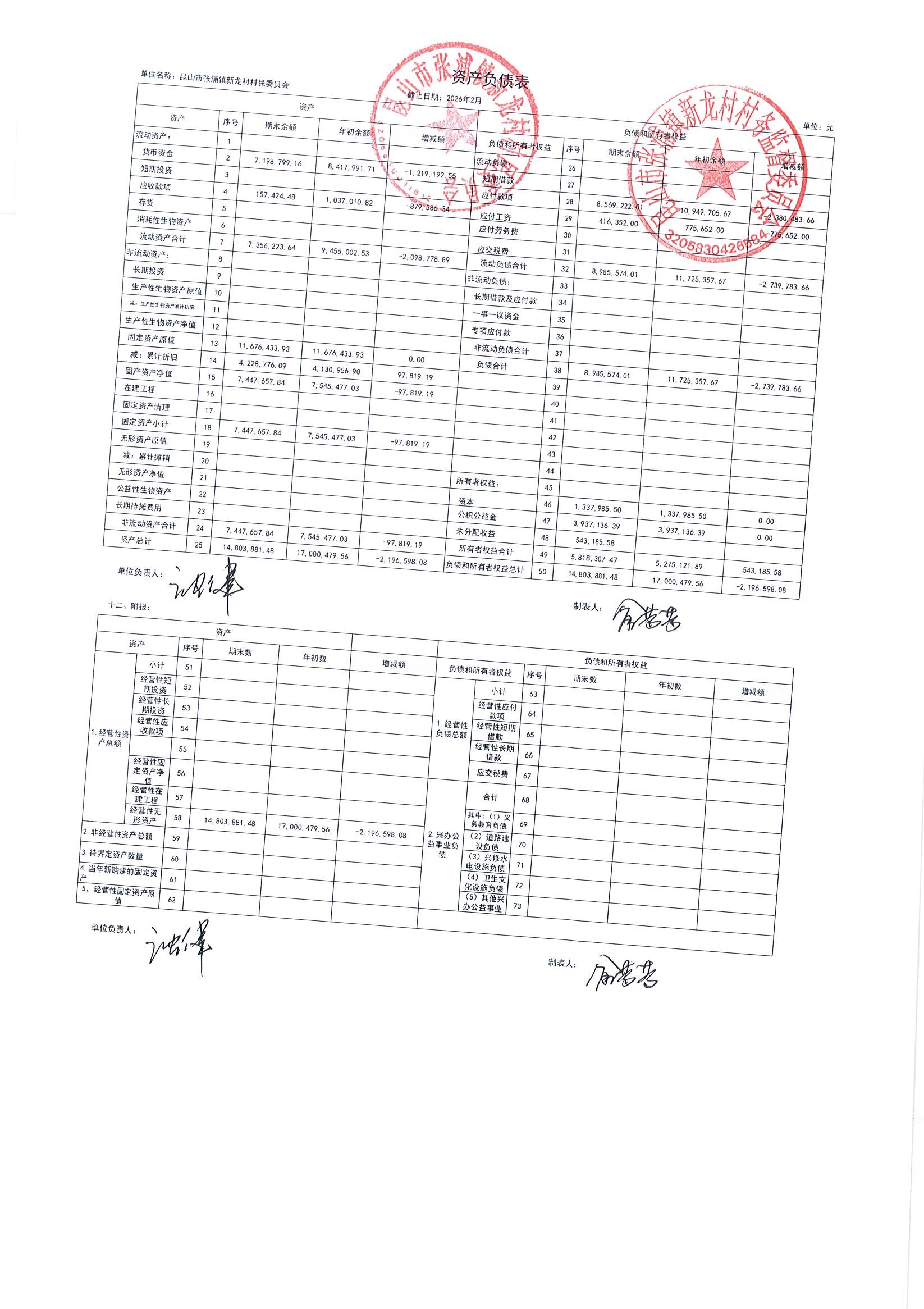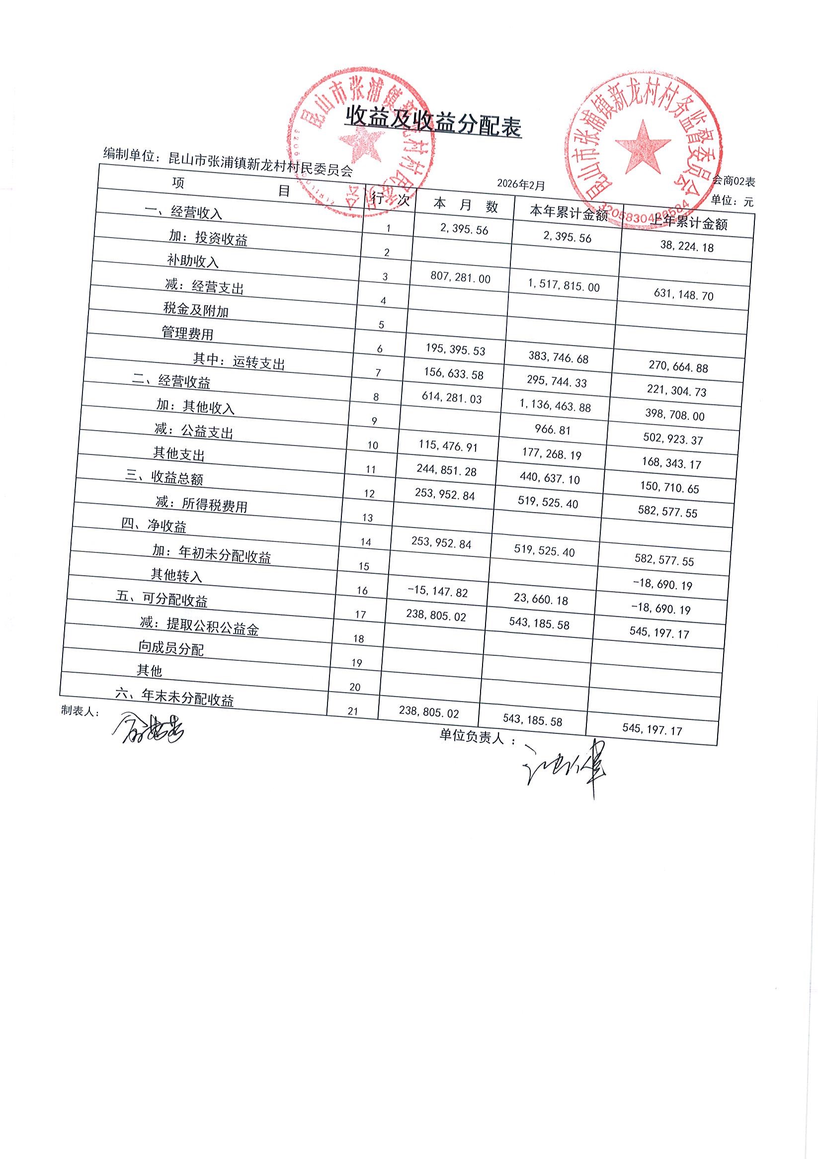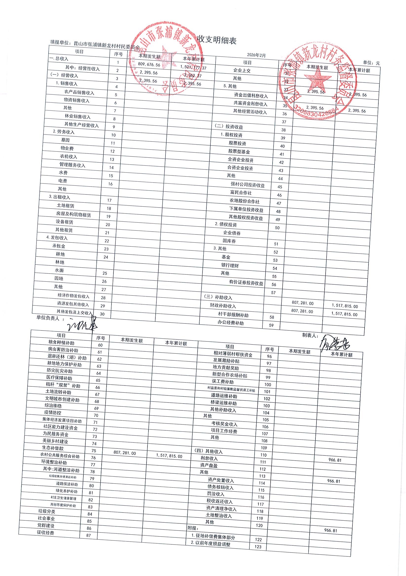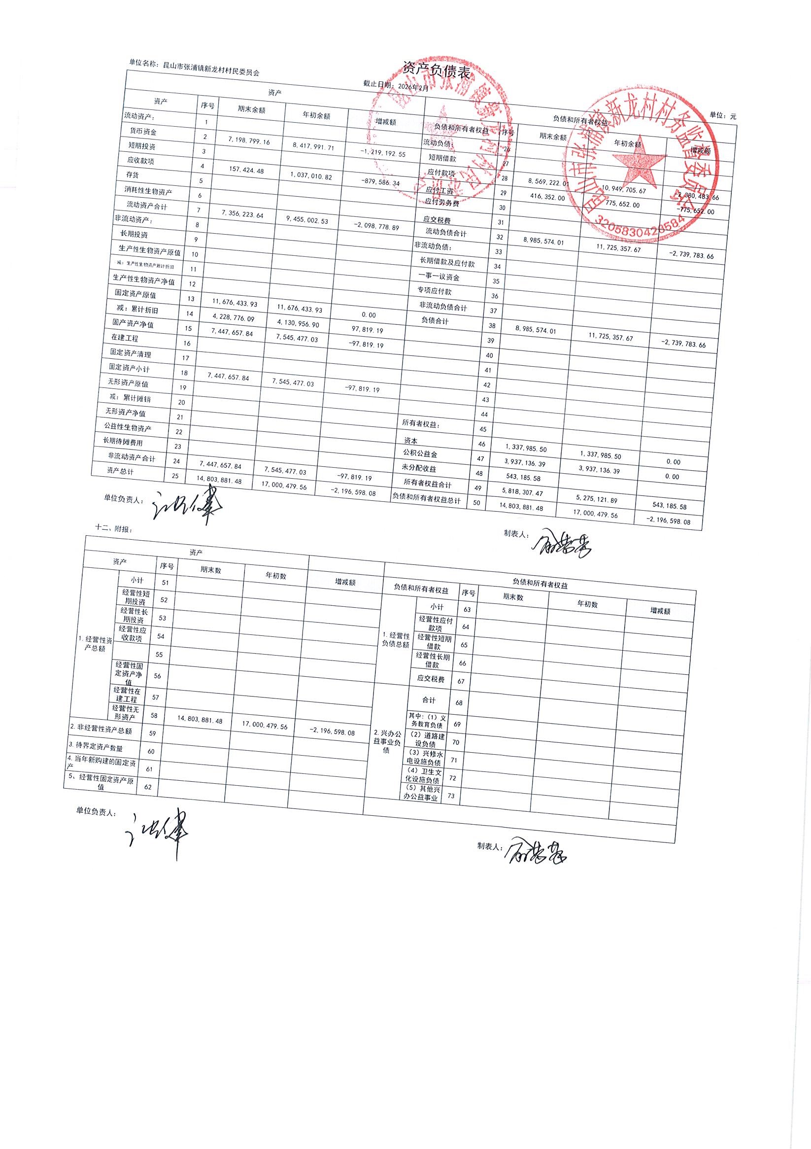2026年张浦镇新龙村村民委员会2月财务公开
