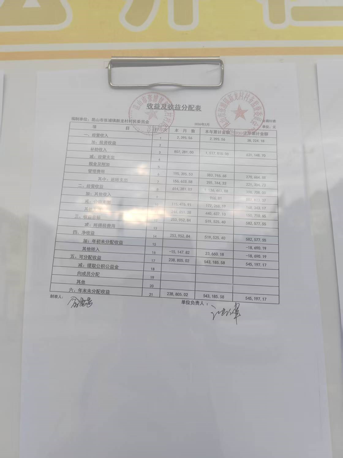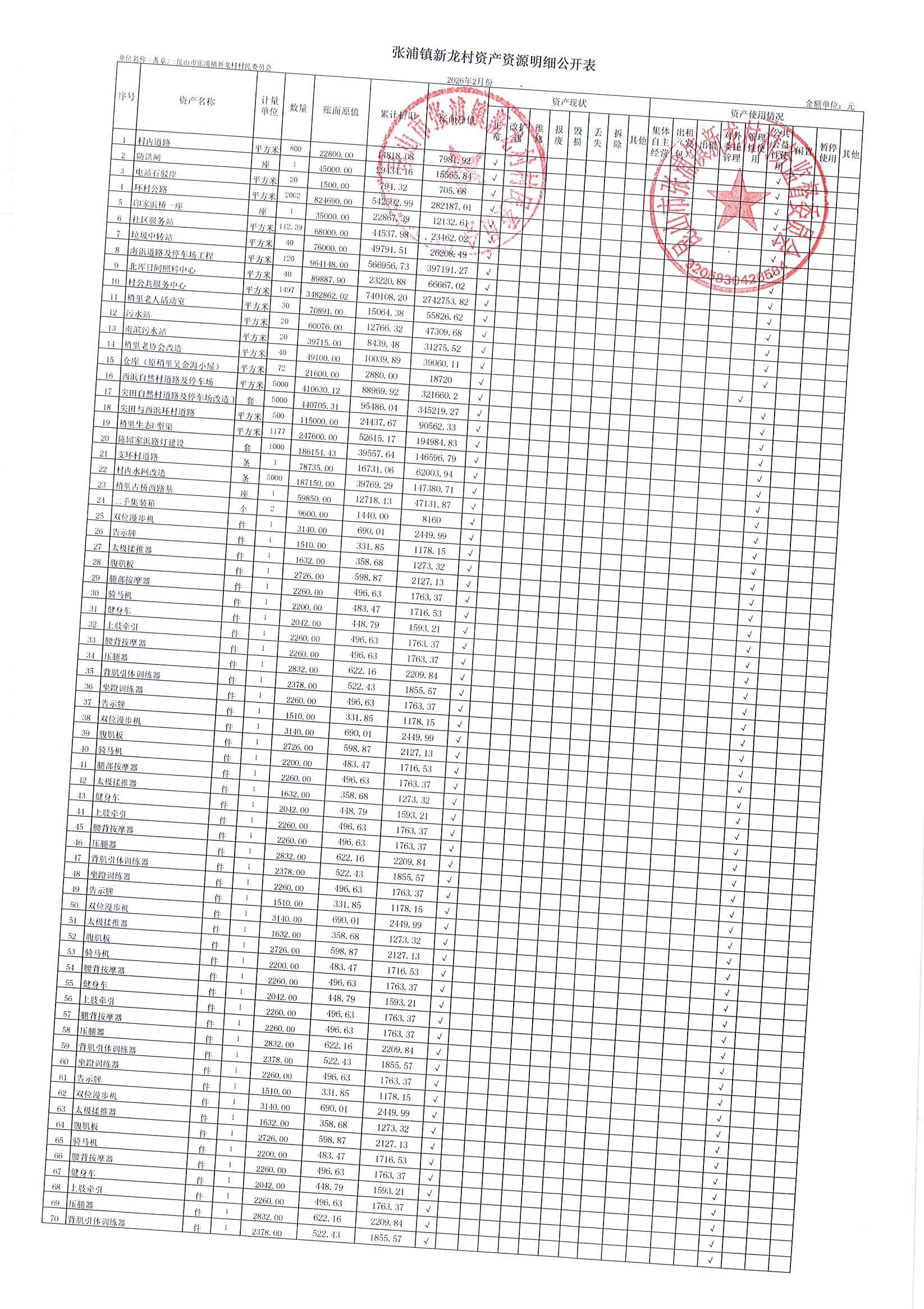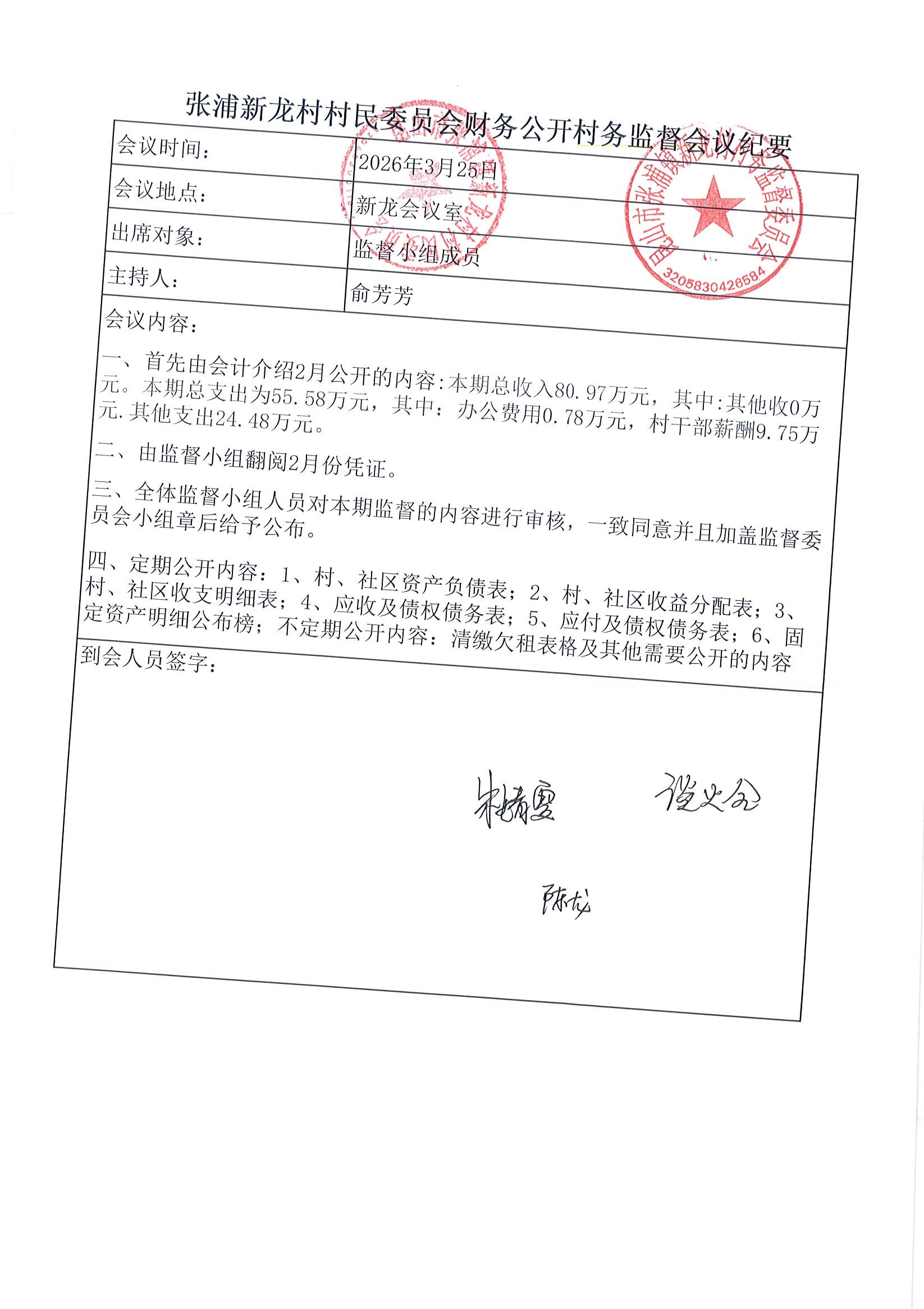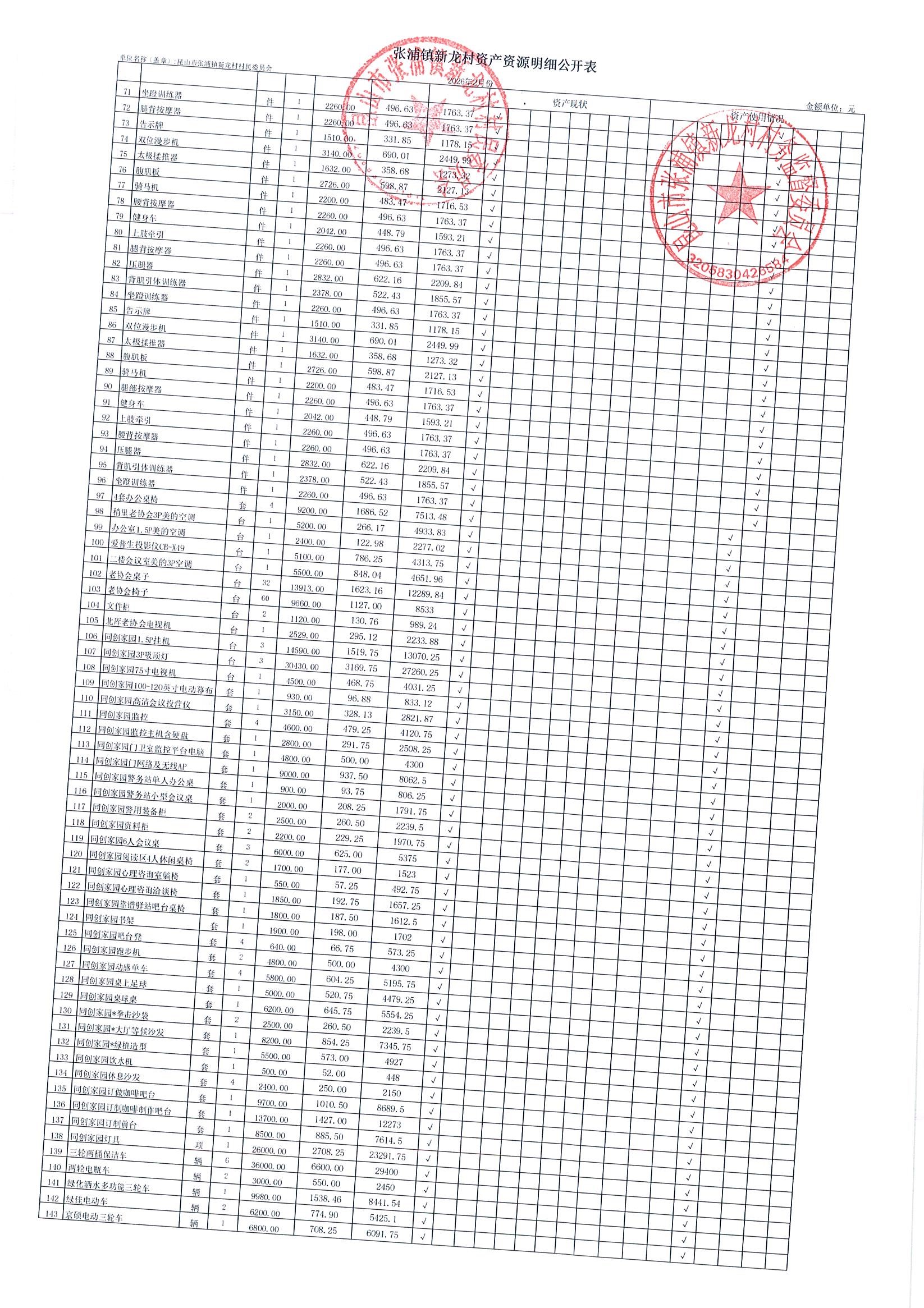 2026年张浦镇新龙村村民委员会2月财务公开