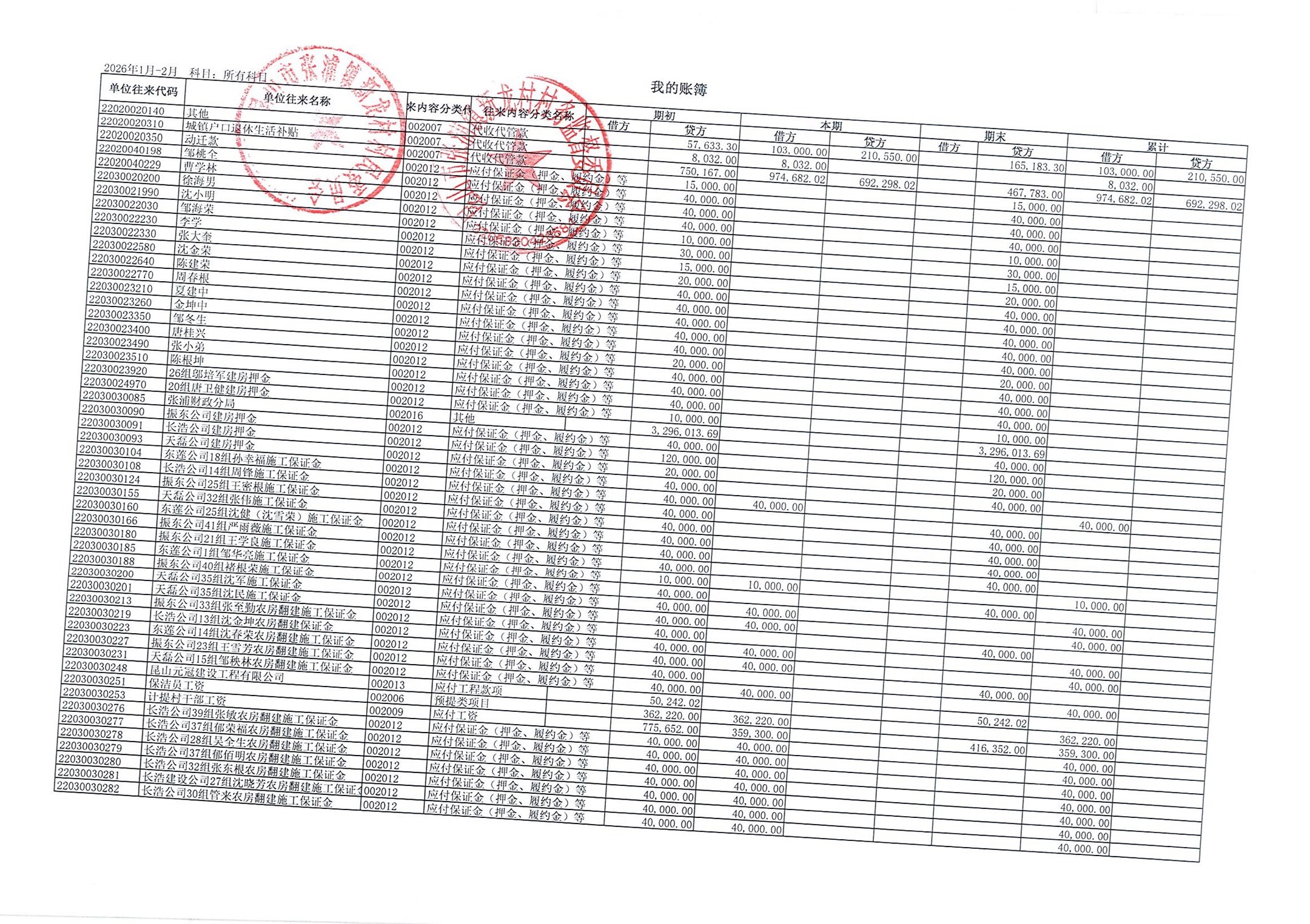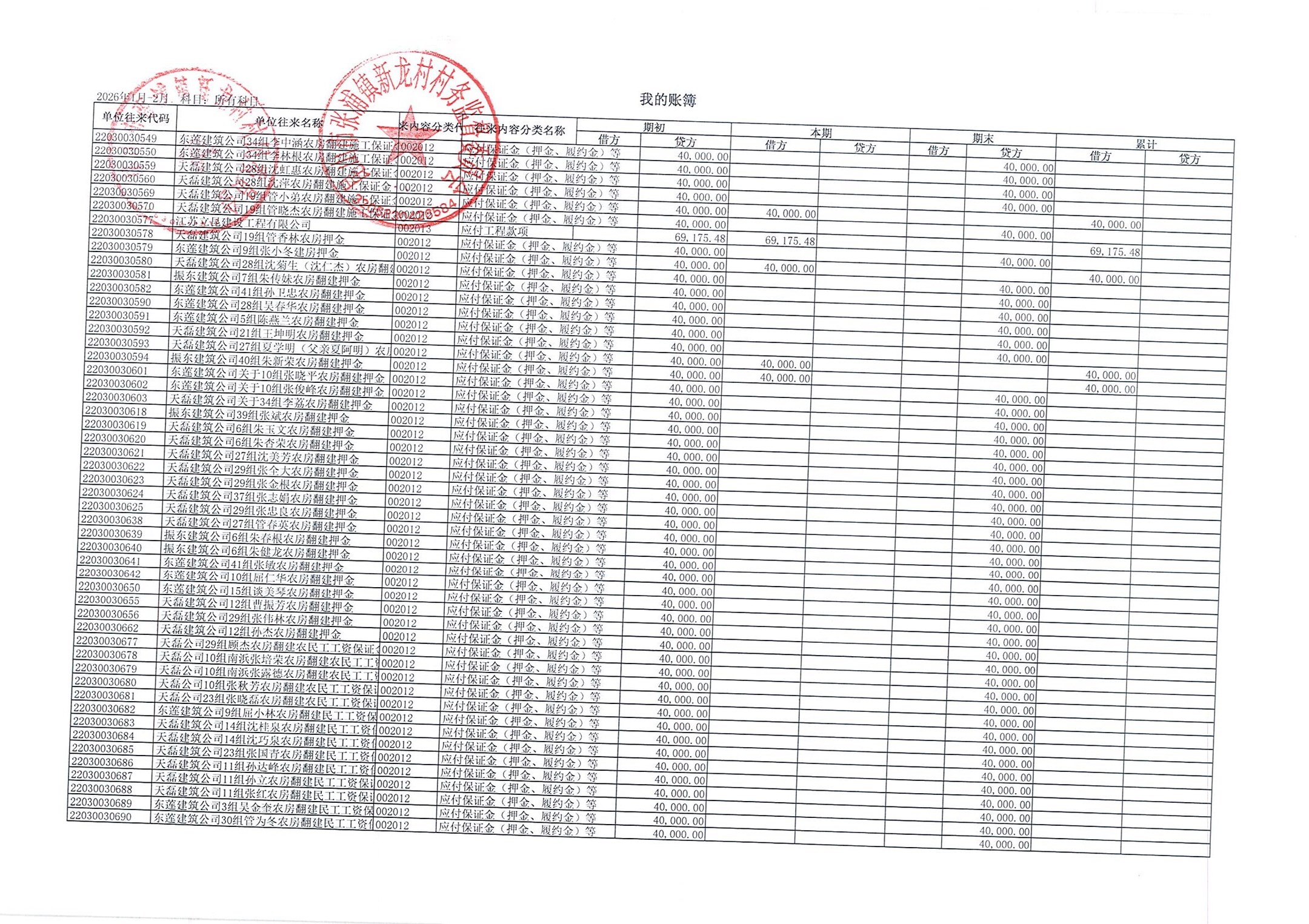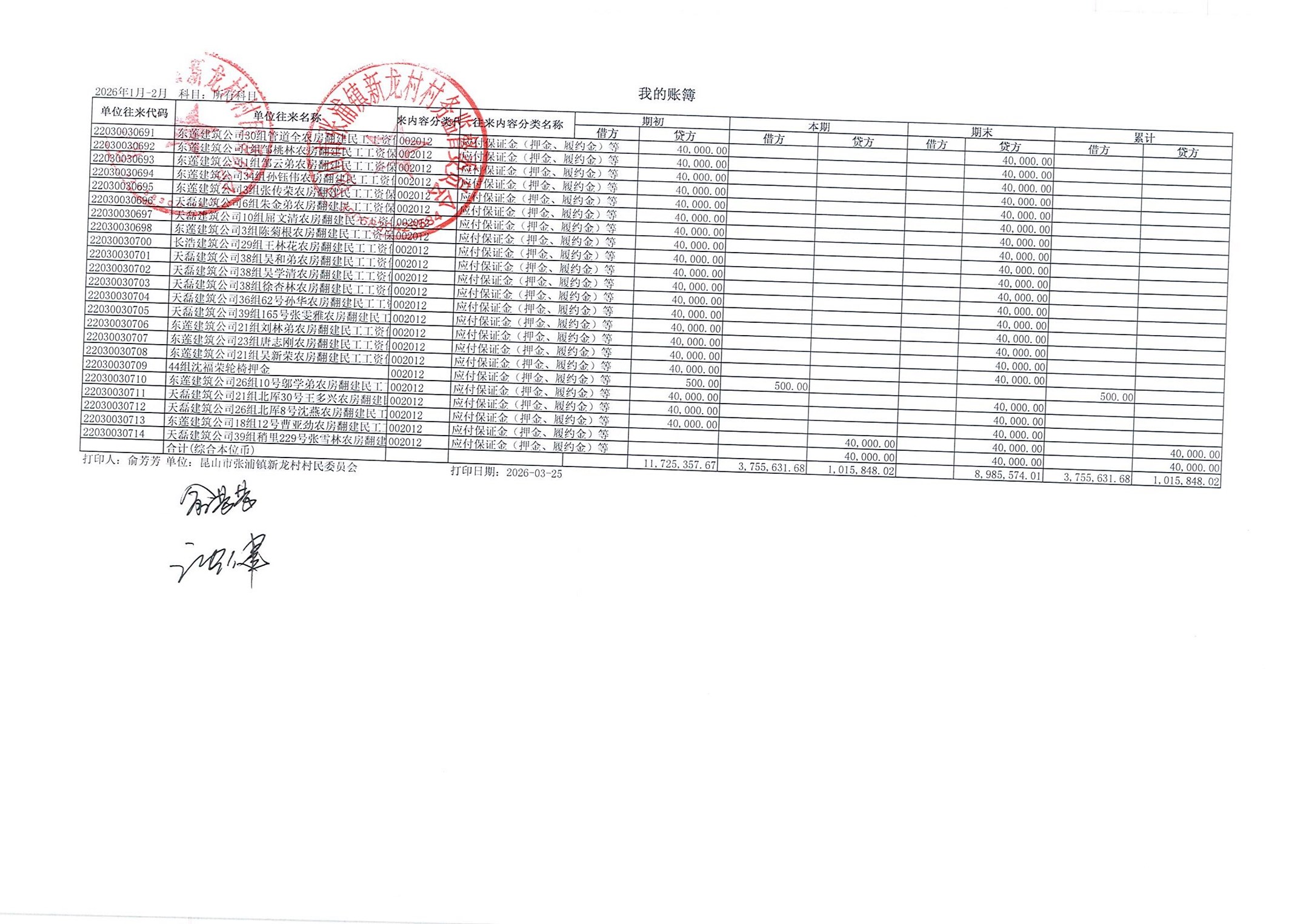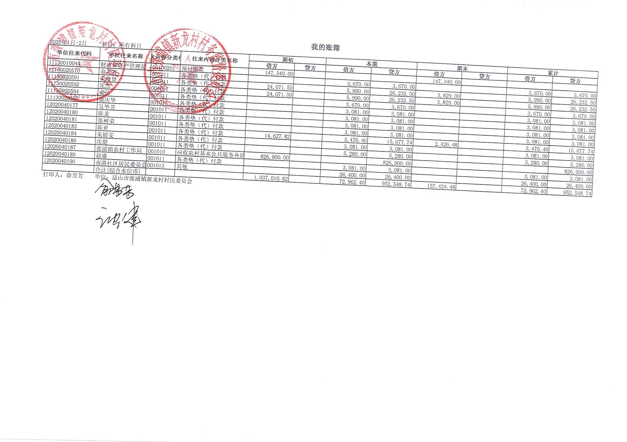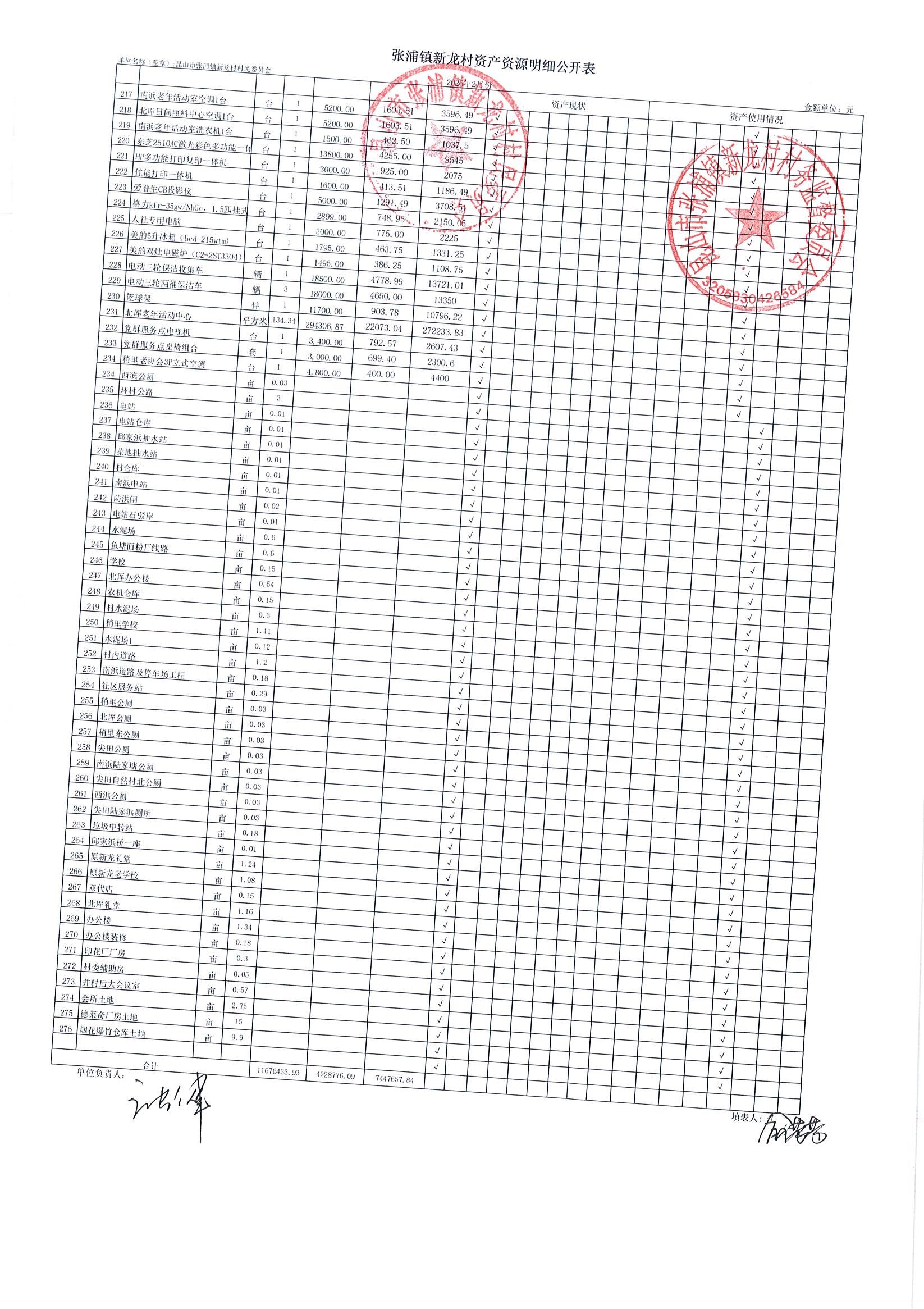 2026年张浦镇新龙村村民委员会2月财务公开