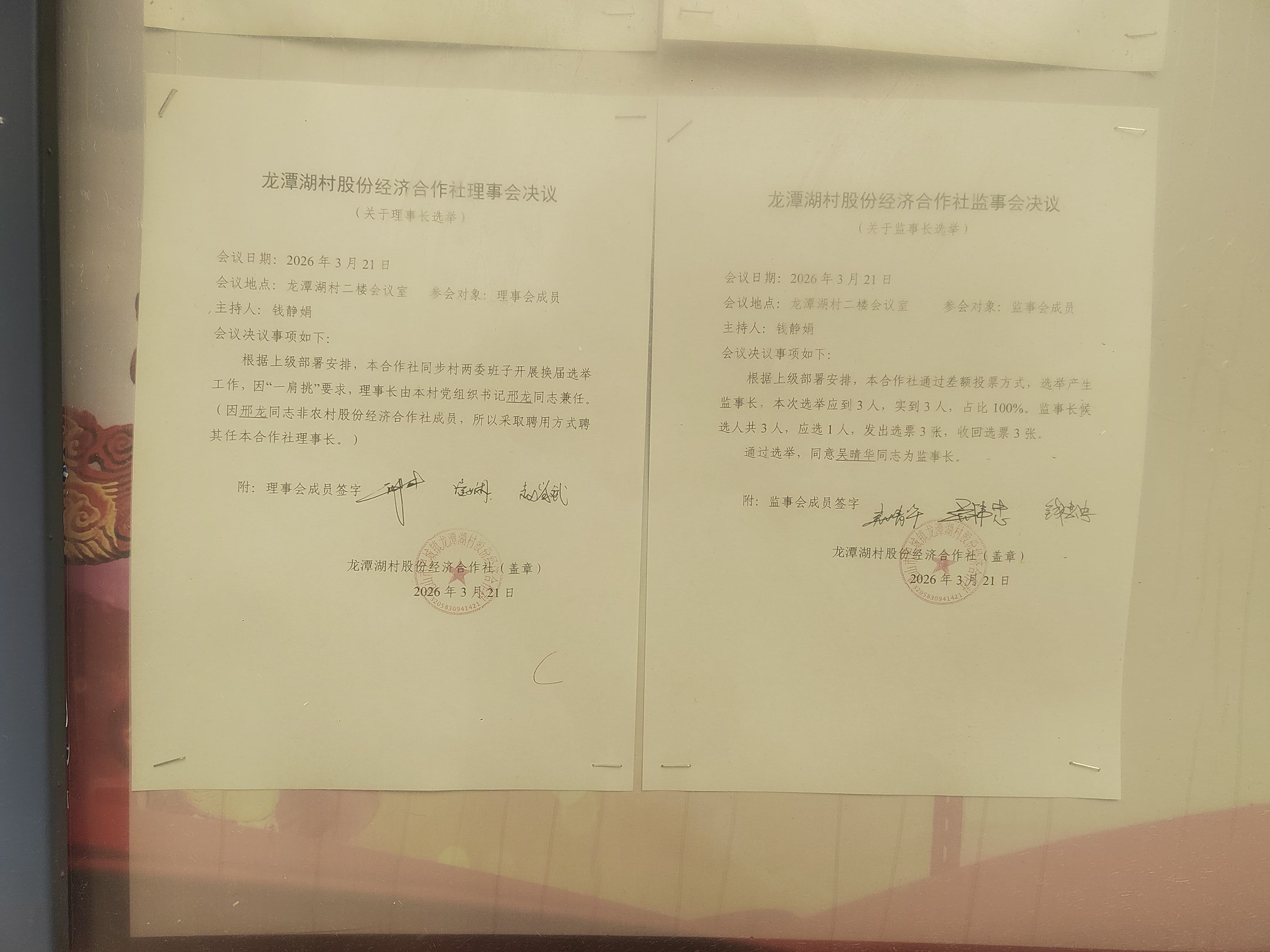 龙潭湖村股份经济合作社理事会、监事会决议(关于理事长、监事长选举)