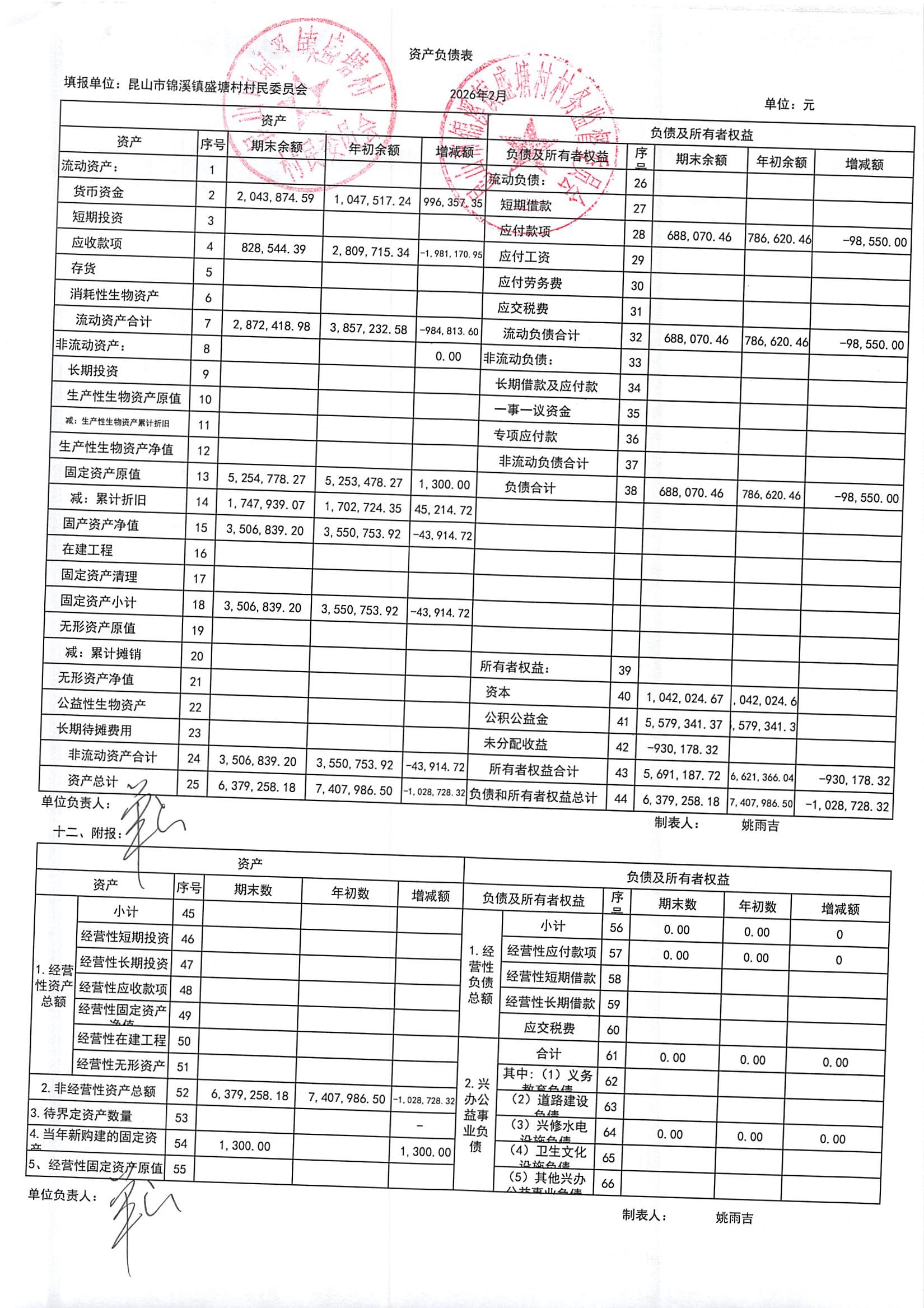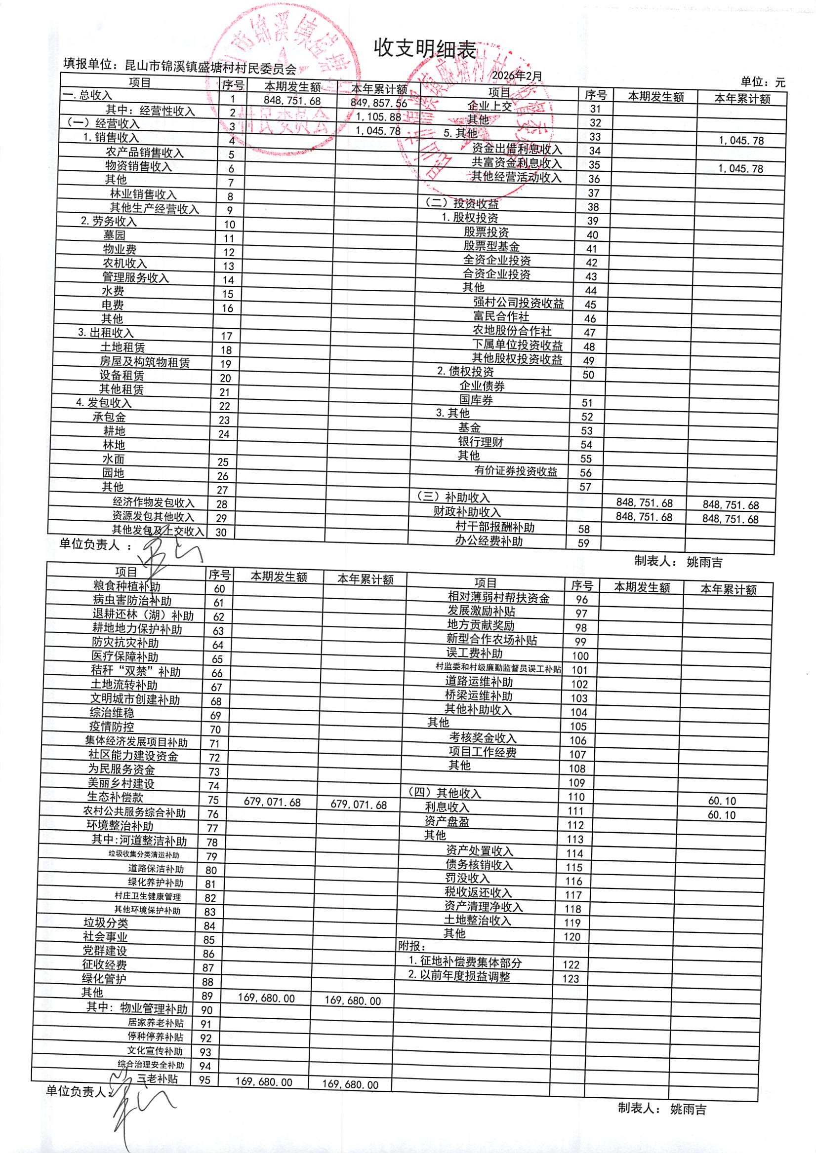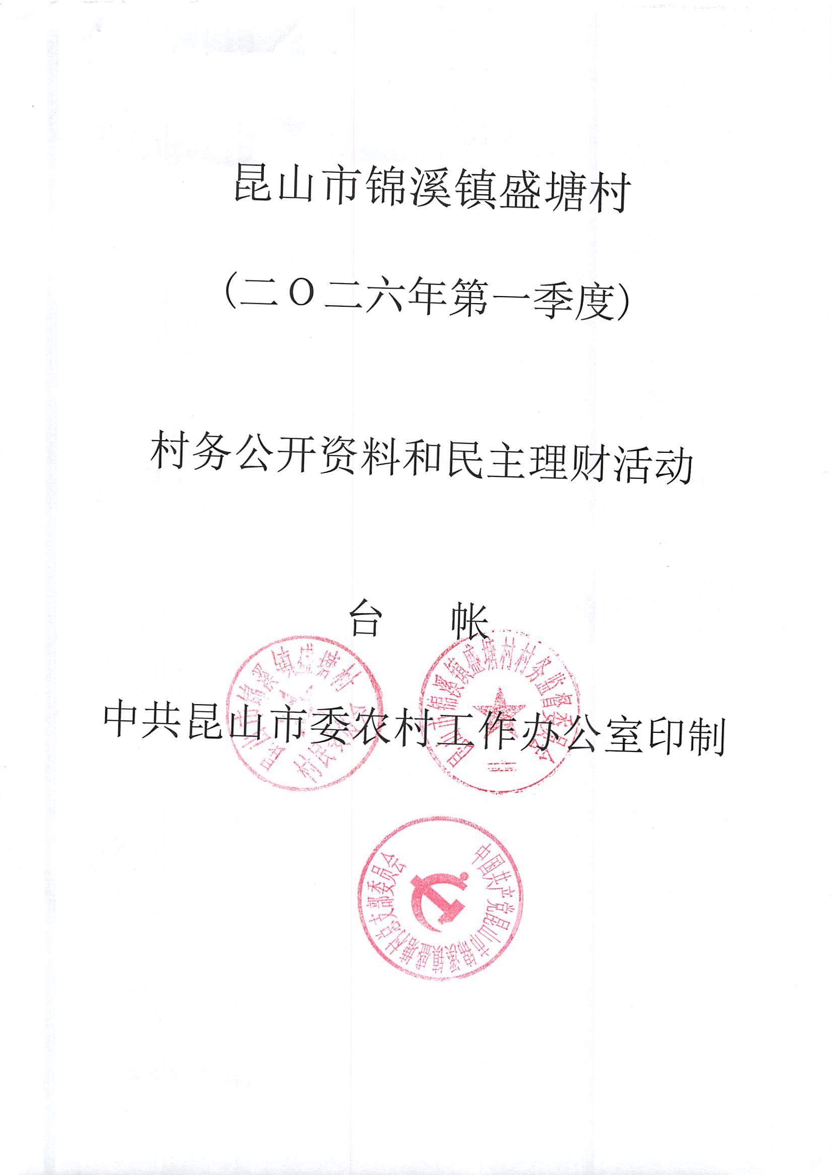 昆山市锦溪镇盛塘村2026年第一季度2月村财务公开资料