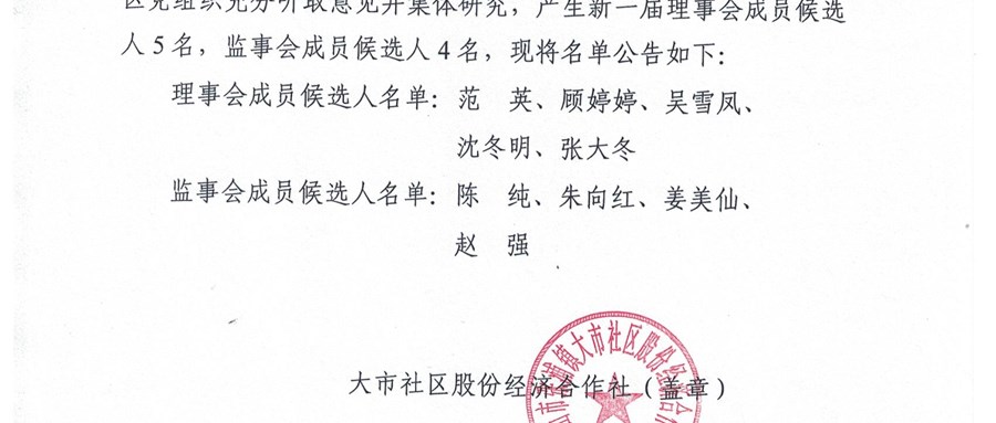 大市社区股份经济合作社换届选举理事会、监事会成员候选人名单第二次公示