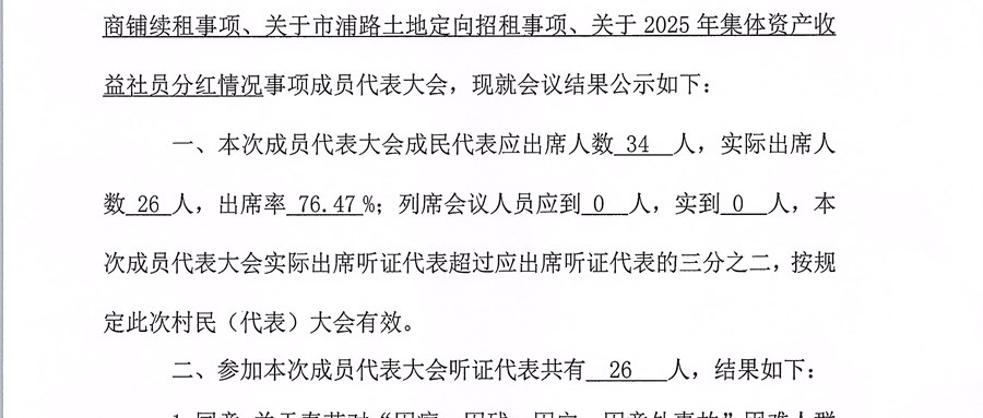关于春节对“因病、因残、因灾、因意外事故”困难人群慰问事宜、关于原村办公楼底楼一间商铺续租事项、关于市浦路土地定向招租事项、关于2025年集体资产收益社员分红情况等事项 成员代表大会结果的公示