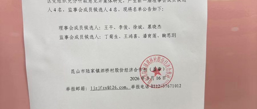 昆山市陆家镇泗桥村股份经济合作社 理事会、监事会成员候选人名单公告