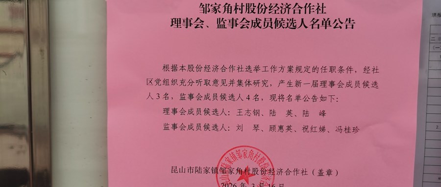 邹家角村股份经济合作社理事会、监事会成员候选人名单公告