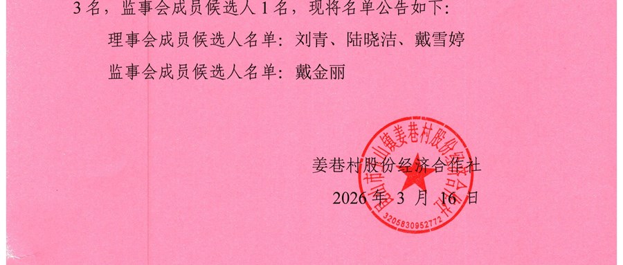 姜巷村股份经济合作社理事会、监事会成员候选人第二轮公示