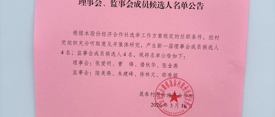 2026年晟泰村股份经济合作社理事会、监事会成员候选人名单公告