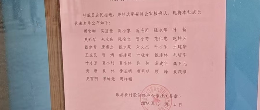歇马桥村股份经济合作社成员代表名单公告