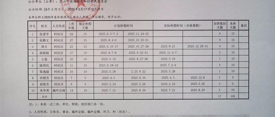 2025年度休假计划(执行情况)公示表