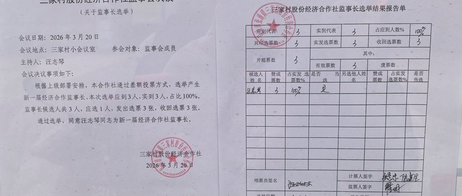 三家村股份经济合作社换届选举监事会计票结果报告单